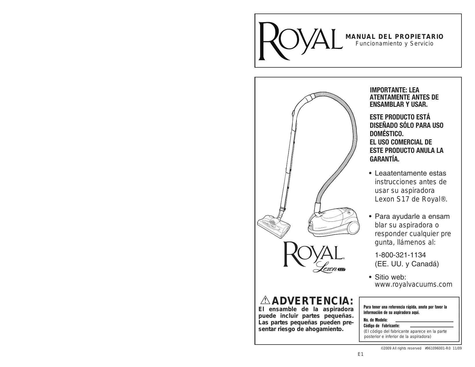 - Leaatentamente estas instrucciones antes de usar su aspiradora Lexon S17 de Royal®.