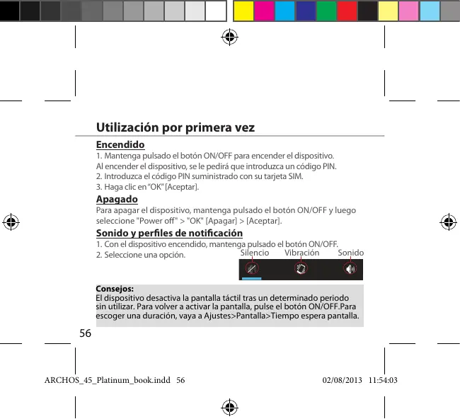 Consejos: El dispositivo desactiva la pantalla táctil tras un determinado periodo sin utilizar. Para volver a activar la pantalla, pulse el botón ON/OFF.Para escoger una duración, vaya a Ajustes>Pantalla>Tiempo espera pantalla.