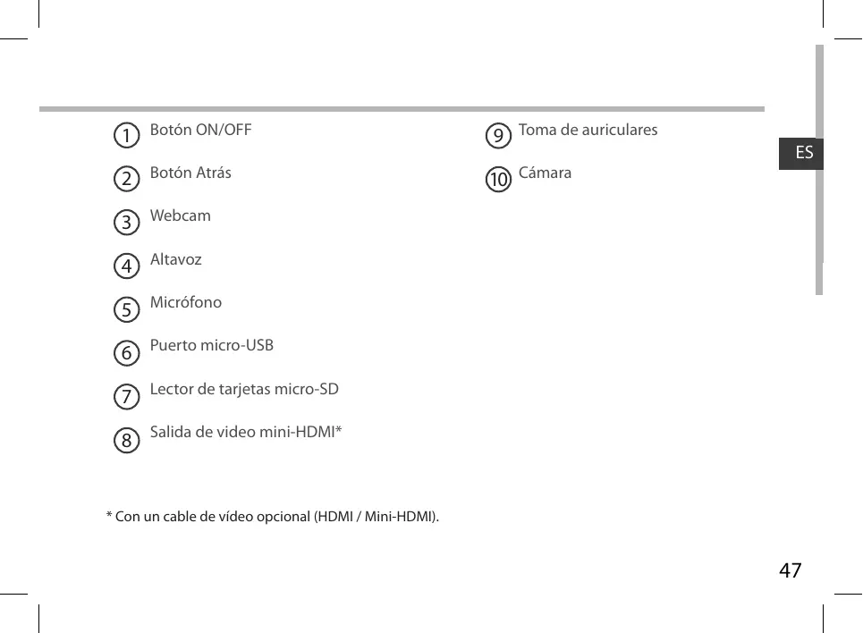 3 Webcam 4 Altavoz 5 Micrófono 6 Puerto micro-USB 7 Lector de tarjetas micro-SD 8 Salida de video mini-HDMI*