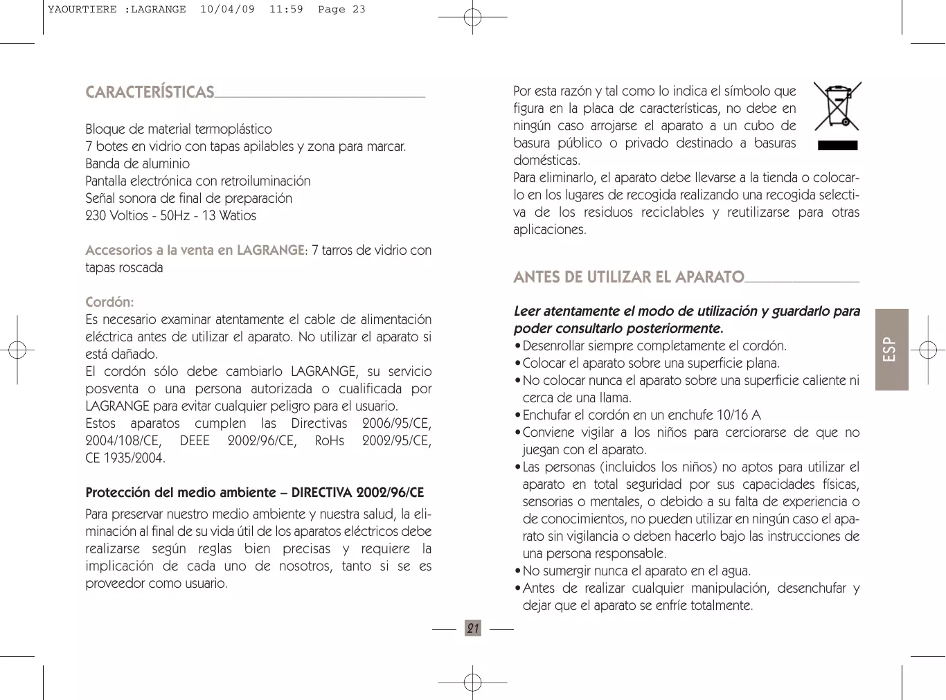 Por esta razón y tal como lo indica el símbolo que figura en la placa de características, no debe en ningún caso arrojarse el aparato a un cubo de basura público o privado destinado a basuras domésticas. Para eliminarlo, el aparato debe llevarse a la tienda o colocarlo en los lugares de recogida realizando una recogida selectiva de los residuos reciclables y reutilizarse para otras aplicaciones. CARACTERÍSTICAS—————————————————————— Bloque de material termoplástico 7 botes en vidrio con tapas apilables y zona para marcar. Banda de aluminio Pantalla electrónica con retroiluminación Señal sonora de final de preparación 230 Voltios - 50Hz - 13 Watios Accesorios a la venta en LAGRANGE: 7 tarros de vidrio con tapas roscada