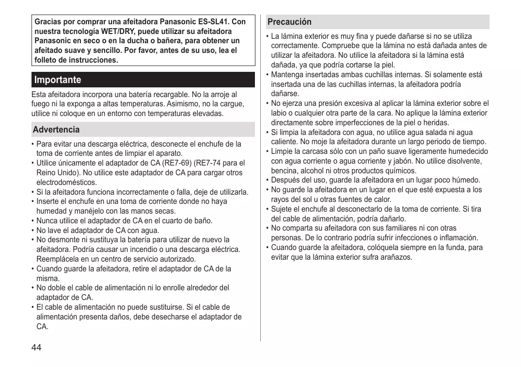 PL Gracias por comprar una afeitadora Panasonic ES‑SL41. Con nuestra tecnología WET/DRY, puede utilizar su afeitadora