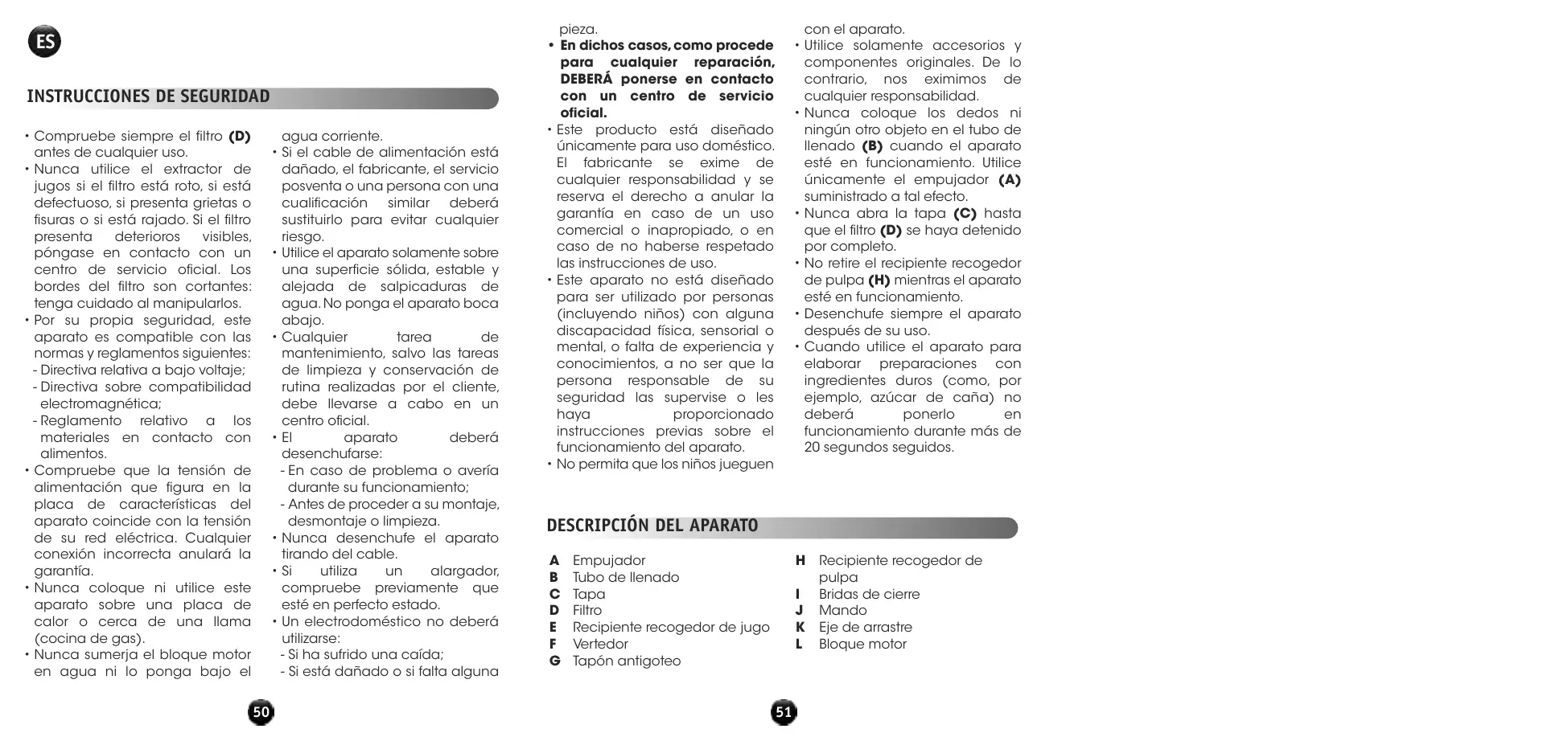 - No retire el recipiente recogedor de pulpa (H) mientras el aparato esté en funcionamiento.