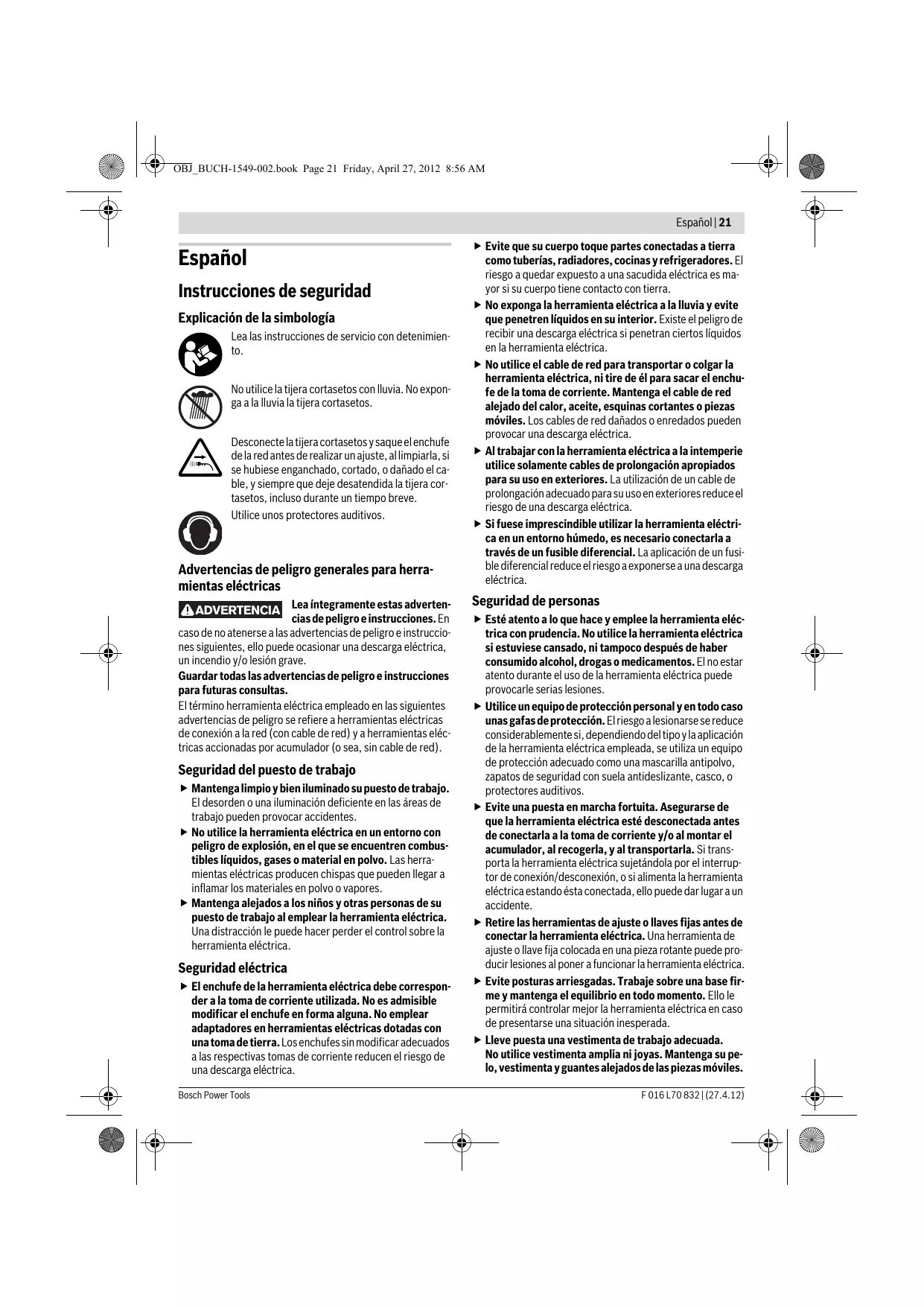 Español Instrucciones de seguridad Explicación de la simbología Lea las instrucciones de servicio con detenimiento. No utilice la tijera cortasetos con lluvia. No exponga a la lluvia la tijera cortasetos. Desconecte la tijera cortasetos y saque el enchufe de la red antes de realizar un ajuste, al limpiarla, si se hubiese enganchado, cortado, o dañado el cable, y siempre que deje desatendida la tijera cortasetos, incluso durante un tiempo breve. Utilice unos protectores auditivos. Advertencias de peligro generales para herramientas eléctricas ADVERTENCIA Lea íntegramente estas advertencias de peligro e instrucciones. En caso de no atenerse a las advertencias de peligro e instrucciones siguientes, ello puede ocasionar una descarga eléctrica, un incendio y/o lesión grave. Guardar todas las advertencias de peligro e instrucciones para futuras consultas. El término herramienta eléctrica empleado en las siguientes advertencias de peligro se refiere a herramientas eléctricas de conexión a la red (con cable de red) y a herramientas eléctricas accionadas por acumulador (o sea, sin cable de red). Seguridad del puesto de trabajo f Mantenga limpio y bien iluminado su puesto de trabajo. El desorden o una iluminación deficiente en las áreas de trabajo pueden provocar accidentes. f No utilice la herramienta eléctrica en un entorno con peligro de explosión, en el que se encuentren combustibles líquidos, gases o material en polvo. Las herramientas eléctricas producen chispas que pueden llegar a inflamar los materiales en polvo o vapores. f Mantenga alejados a los niños y otras personas de su puesto de trabajo al emplear la herramienta eléctrica. Una distracción le puede hacer perder el control sobre la herramienta eléctrica. Seguridad eléctrica f El enchufe de la herramienta eléctrica debe corresponder a la toma de corriente utilizada. No es admisible modificar el enchufe en forma alguna. No emplear adaptadores en herramientas eléctricas dotadas con una toma de tierra. Los enchufes sin modificar adecuados a las respectivas tomas de corriente reducen el riesgo de una descarga eléctrica. Bosch Power Tools f Evite que su cuerpo toque partes conectadas a tierra como tuberías, radiadores, cocinas y refrigeradores. El riesgo a quedar expuesto a una sacudida eléctrica es mayor si su cuerpo tiene contacto con tierra. f No exponga la herramienta eléctrica a la lluvia y evite que penetren líquidos en su interior. Existe el peligro de recibir una descarga eléctrica si penetran ciertos líquidos en la herramienta eléctrica. f No utilice el cable de red para transportar o colgar la herramienta eléctrica, ni tire de él para sacar el enchufe de la toma de corriente. Mantenga el cable de red alejado del calor, aceite, esquinas cortantes o piezas móviles. Los cables de red dañados o enredados pueden provocar una descarga eléctrica. f Al trabajar con la herramienta eléctrica a la intemperie utilice solamente cables de prolongación apropiados para su uso en exteriores. La utilización de un cable de prolongación adecuado para su uso en exteriores reduce el riesgo de una descarga eléctrica. f Si fuese imprescindible utilizar la herramienta eléctrica en un entorno húmedo, es necesario conectarla a través de un fusible diferencial. La aplicación de un fusible diferencial reduce el riesgo a exponerse a una descarga eléctrica. Seguridad de personas f Esté atento a lo que hace y emplee la herramienta eléctrica con prudencia. No utilice la herramienta eléctrica si estuviese cansado, ni tampoco después de haber consumido alcohol, drogas o medicamentos. El no estar atento durante el uso de la herramienta eléctrica puede provocarle serias lesiones. f Utilice un equipo de protección personal y en todo caso unas gafas de protección. El riesgo a lesionarse se reduce considerablemente si, dependiendo del tipo y la aplicación de la herramienta eléctrica empleada, se utiliza un equipo de protección adecuado como una mascarilla antipolvo, zapatos de seguridad con suela antideslizante, casco, o protectores auditivos. f Evite una puesta en marcha fortuita. Asegurarse de que la herramienta eléctrica esté desconectada antes de conectarla a la toma de corriente y/o al montar el acumulador, al recogerla, y al transportarla. Si transporta la herramienta eléctrica sujetándola por el interruptor de conexión/desconexión, o si alimenta la herramienta eléctrica estando ésta conectada, ello puede dar lugar a un accidente. f Retire las herramientas de ajuste o llaves fijas antes de conectar la herramienta eléctrica. Una herramienta de ajuste o llave fija colocada en una pieza rotante puede producir lesiones al poner a funcionar la herramienta eléctrica. f Evite posturas arriesgadas. Trabaje sobre una base firme y mantenga el equilibrio en todo momento. Ello le permitirá controlar mejor la herramienta eléctrica en caso de presentarse una situación inesperada. f Lleve puesta una vestimenta de trabajo adecuada. No utilice vestimenta amplia ni joyas. Mantenga su pelo, vestimenta y guantes alejados de las piezas móviles. F 016 L70 832 | (27.4.12) 22 | Español La vestimenta suelta, el pelo largo y las joyas se pueden enganchar con las piezas en movimiento. f Siempre que sea posible utilizar unos equipos de aspiración o captación de polvo, asegúrese que éstos estén montados y que sean utilizados correctamente. El empleo de estos equipos reduce los riesgos derivados del polvo. Uso y trato cuidadoso de herramientas eléctricas f No sobrecargue la herramienta eléctrica. Use la herramienta eléctrica prevista para el trabajo a realizar. Con la herramienta adecuada podrá trabajar mejor y más seguro dentro del margen de potencia indicado. f No utilice herramientas eléctricas con un interruptor defectuoso. Las herramientas eléctricas que no se puedan conectar o desconectar son peligrosas y deben hacerse reparar. f Saque el enchufe de la red y/o desmonte el acumulador antes de realizar u