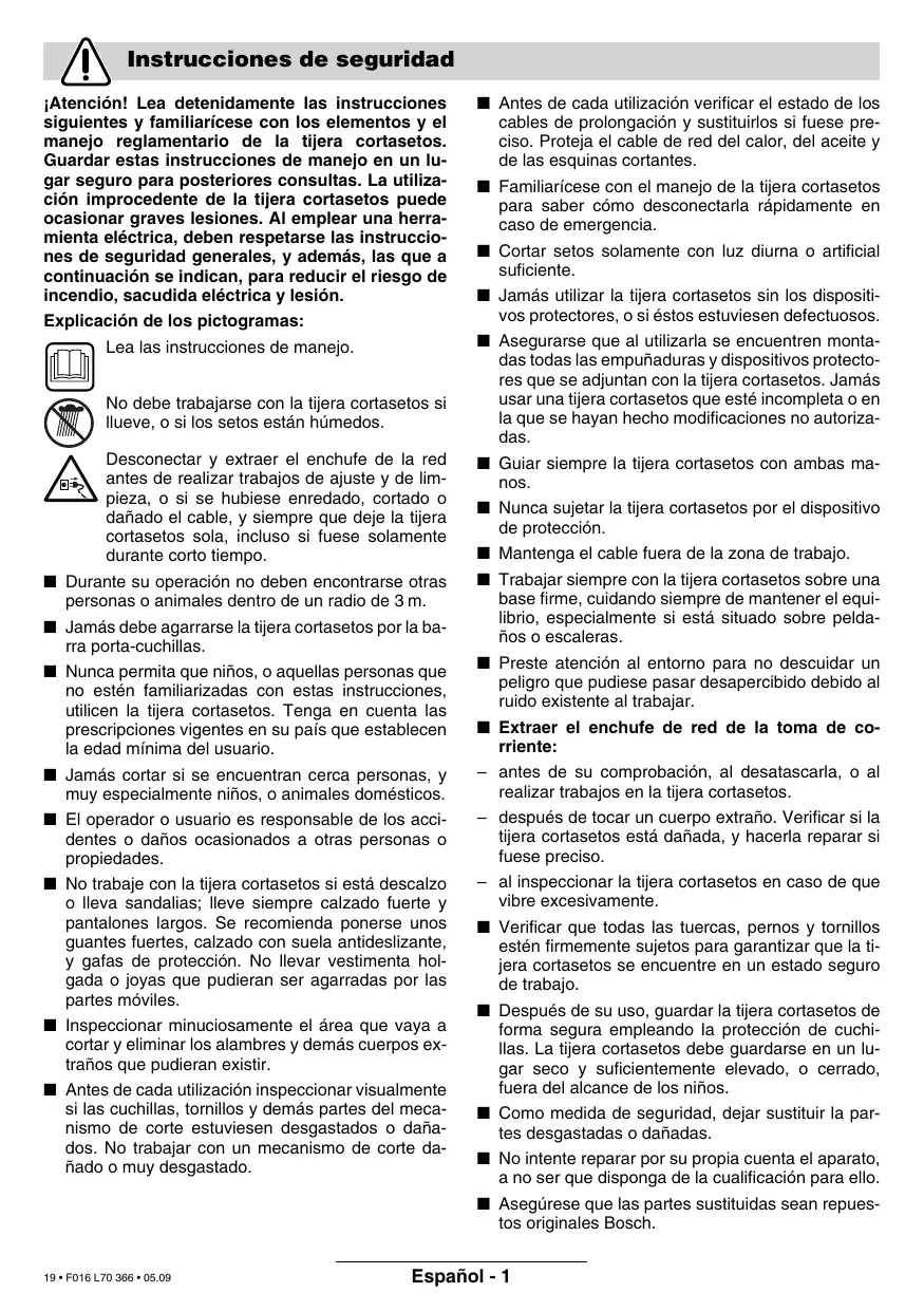 Instrucciones de seguridad ¡Atención! Lea detenidamente las instrucciones siguientes y familiarícese con los elementos y el manejo reglamentario de la tijera cortasetos. Guardar estas instrucciones de manejo en un lugar seguro para posteriores consultas. La utilización improcedente de la tijera cortasetos puede ocasionar graves lesiones. Al emplear una herramienta eléctrica, deben respetarse las instrucciones de seguridad generales, y además, las que a continuación se indican, para reducir el riesgo de incendio, sacudida eléctrica y lesión. Explicación de los pictogramas: Lea las instrucciones de manejo. No debe trabajarse con la tijera cortasetos si llueve, o si los setos están húmedos. Desconectar y extraer el enchufe de la red antes de realizar trabajos de ajuste y de limpieza, o si se hubiese enredado, cortado o dañado el cable, y siempre que deje la tijera cortasetos sola, incluso si fuese solamente durante corto tiempo. ■ Durante su operación no deben encontrarse otras personas o animales dentro de un radio de 3 m. ■ Jamás debe agarrarse la tijera cortasetos por la barra porta-cuchillas. ■ Antes de cada utilización verificar el estado de los cables de prolongación y sustituirlos si fuese preciso. Proteja el cable de red del calor, del aceite y de las esquinas cortantes. ■ Familiarícese con el manejo de la tijera cortasetos para saber cómo desconectarla rápidamente en caso de emergencia. ■ Cortar setos solamente con luz diurna o artificial suficiente. ■ Jamás utilizar la tijera cortasetos sin los dispositivos protectores, o si éstos estuviesen defectuosos. ■ Asegurarse que al utilizarla se encuentren montadas todas las empuñaduras y dispositivos protectores que se adjuntan con la tijera cortasetos. Jamás usar una tijera cortasetos que esté incompleta o en la que se hayan hecho modificaciones no autorizadas. ■ Guiar siempre la tijera cortasetos con ambas manos. ■ Nunca sujetar la tijera cortasetos por el dispositivo de protección. ■ Mantenga el cable fuera de la zona de trabajo. ■ Trabajar siempre con la tijera cortasetos sobre una base firme, cuidando siempre de mantener el equilibrio, especialmente si está situado sobre peldaños o escaleras. ■ Preste atención al entorno para no descuidar un peligro que pudiese pasar desapercibido debido al ruido existente al trabajar. ■ Nunca permita que niños, o aquellas personas que no estén familiarizadas con estas instrucciones, utilicen la tijera cortasetos. Tenga en cuenta las prescripciones vigentes en su país que establecen la edad mínima del usuario. ■ Extraer el enchufe de red de la toma de corriente: ■ Jamás cortar si se encuentran cerca personas, y muy especialmente niños, o animales domésticos. – antes de su comprobación, al desatascarla, o al realizar trabajos en la tijera cortasetos. ■ El operador o usuario es responsable de los accidentes o daños ocasionados a otras personas o propiedades. – después de tocar un cuerpo extraño. Verificar si la tijera cortasetos está dañada, y hacerla reparar si fuese preciso. ■ No trabaje con la tijera cortasetos si está descalzo o lleva sandalias; lleve siempre calzado fuerte y pantalones largos. Se recomienda ponerse unos guantes fuertes, calzado con suela antideslizante, y gafas de protección. No llevar vestimenta holgada o joyas que pudieran ser agarradas por las partes móviles. – al inspeccionar la tijera cortasetos en caso de que vibre excesivamente. ■ Inspeccionar minuciosamente el área que vaya a cortar y eliminar los alambres y demás cuerpos extraños que pudieran existir. ■ Antes de cada utilización inspeccionar visualmente si las cuchillas, tornillos y demás partes del mecanismo de corte estuviesen desgastados o dañados. No trabajar con un mecanismo de corte dañado o muy desgastado. ■ Verificar que todas las tuercas, pernos y tornillos estén firmemente sujetos para garantizar que la tijera cortasetos se encuentre en un estado seguro de trabajo. ■ Después de su uso, guardar la tijera cortasetos de forma segura empleando la protección de cuchillas. La tijera cortasetos debe guardarse en un lugar seco y suficientemente elevado, o cerrado, fuera del alcance de los niños. ■ Como medida de seguridad, dejar sustituir la partes desgastadas o dañadas. ■ No intente reparar por su propia cuenta el aparato, a no ser que disponga de la cualificación para ello. ■ Asegúrese que las partes sustituidas sean repuestos originales Bosch. 19 • F016 L70 366 • 05.09 Español - 1 Características técnicas Tijera cortasetos Número de pedido Potencia absorbida Nº de carreras en vacío Separación entre cuchillas Longitud de corte Peso Clase de protección Tijera cortasetos Número de pedido Potencia absorbida Nº de carreras en vacío Separación entre cuchillas Longitud de corte Peso Clase de protección 7 Protección de cuchillas 8 Número de serie Utilización reglamentaria El aparato ha sido proyectado para cortar y recortar setos y arbustos en jardines domésticos y particulares. **específico de cada país ¡Los accesorios descritos e ilustrados no corresponden en parte al material que se adjunta! Introducción Para su seguridad Este manual comprende las instrucciones sobre el montaje correcto y el uso seguro de la tijera cortasetos. Por ello, es muy importante que lea detenidamente estas instrucciones. Material que se adjunta Todas las partes del aparato deben sacarse con cuidado del embalaje debiendo controlar además su integridad: – Tijera cortasetos – Protección de cuchillas – Instrucciones de manejo Si faltasen piezas, o si alguna de ellas estuviese dañada, diríjase por favor al comercio de su adquisición. Elementos de la máquina 1 Barra porta-cuchillas 2 Protección para las manos para la empuñadura delantera 3 Empuñadura de estribo delantera con palanca de conexión 4 Rejillas de refrigeración 5 Empuñadura posterior con interruptor de conexión/desconexión 6 Enchufe de