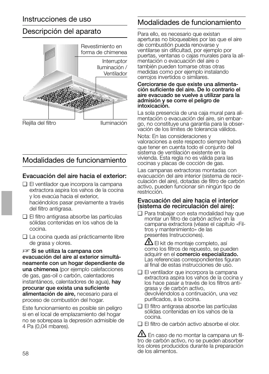 Para ello, es necesario que existan aperturas no bloqueables por las que el aire de combustión pueda renovarse y ventilarse sin dificultad, por ejemplo por puertas, ventanas o cajas murales para la alimentación o evacuación del aire o también pueden tomarse otras otras medidas como por ejemplo instalando cerrojos invertidos o similares. Cerciorarse de que existe una alimentación suficiente del aire. De lo contrario el aire evacuado se vuelve a utilizar para la admisión y se corre el peligro de intoxicación. La sola presencia de una caja mural para alimentación o evacuación del aire, sin embargo, no constituye una garantía para la observación de los límites de tolerancia válidos. Nota: En las consideraciones y valoraciones a este respecto siempre habrá que tener en cuenta todo el conjunto del sistema de ventilación existente en la vivienda. Esta regla no es válida para las cocinas y placas de cocción de gas. Las campanas extractoras montadas con evacuación del aire interior (sistema de recirculación del aire), dotadas de filtro de carbón activo, pueden funcionar sin ningún tipo de restricción. Evacuación del aire hacia el interior (sistema de recirculación del aire): ❑ Para trabajar con esta modalidad hay que montar un filtro de carbón activo en la campana extractora (véase el capítulo «Filtros y mantenimiento» de las presentes Instrucciones). El kit de montaje completo, así como los filtros de repuesto, se pueden adquirir en el comercio especializado. Las referencias correspondientes figuran al final de estas instrucciones de uso. ❑ El ventilador que incorpora la campana extractora aspira los vahos de la cocina y los hace pasar a través de los filtros antigrasa y de carbón activo, devolviéndolos a continuación, una vez purificados, a la cocina. ❑ El filtro antigrasa absorbe las partículas sólidas contenidas en los vahos de la cocina. ❑ El filtro de carbón activo absorbe el olor.
