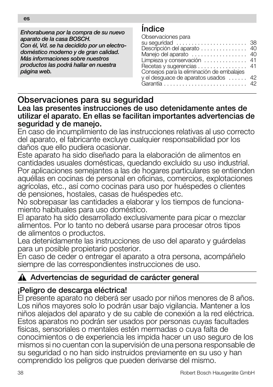 ¡Peligro de descarga eléctrica! El presente aparato no deberá ser usado por niños menores de 8 años. Los niños mayores solo lo podrán usar bajo vigilancia. Mantener a los niños alejados del aparato y de su cable de conexión a la red eléctrica. Estos aparatos no podrán ser usados por personas cuyas facultades físicas, sensoriales o mentales estén mermadas o cuya falta de conocimientos o de experiencia les impida hacer un uso seguro de los mismos si no cuentan con la supervisión de una persona responsable de su seguridad o no han sido instruidos previamente en su uso y han comprendido los peligros que pueden derivarse del mismo. 38