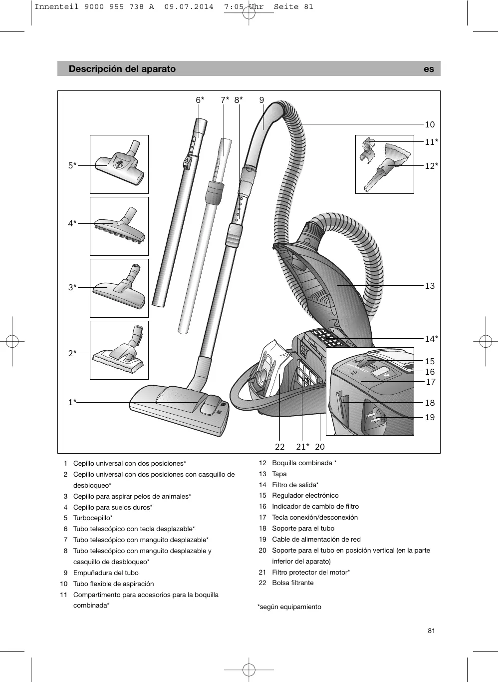 21* 20 1 Cepillo universal con dos posiciones* 2 Cepillo universal con dos posiciones con casquillo de 13 Tapa desbloqueo* 4 Cepillo para suelos duros* 16 Indicador de cambio de filtro 5 Turbocepillo* 17 Tecla conexión/desconexión 6 Tubo telescópico con tecla desplazable* 18 Soporte para el tubo 7 Tubo telescópico con manguito desplazable* 19 Cable de alimentación de red 8 Tubo telescópico con manguito desplazable y 20 Soporte para el tubo en posición vertical (en la parte casquillo de desbloqueo* 9 Empuñadura del tubo 10 Tubo flexible de aspiración inferior del aparato) 21 Filtro protector del motor* 22 Bolsa filtrante 11 Compartimento para accesorios para la boquilla combinada* *según equipamiento