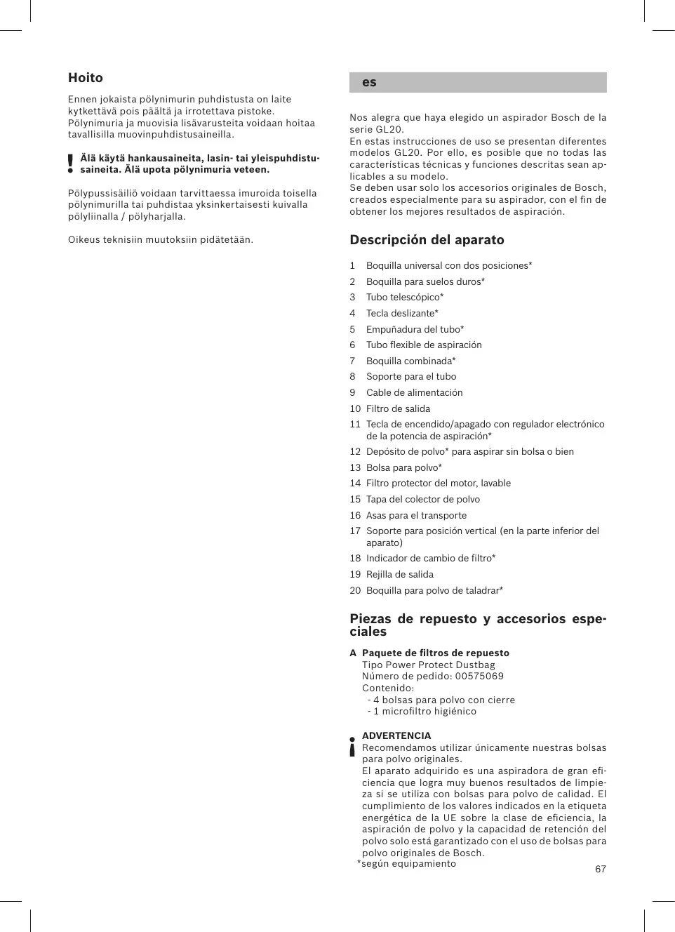 Nos alegra que haya elegido un aspirador Bosch de la serie GL20. En estas instrucciones de uso se presentan diferentes modelos GL20. Por ello, es posible que no todas las características técnicas y funciones descritas sean aplicables a su modelo. Se deben usar solo los accesorios originales de Bosch, creados especialmente para su aspirador, con el fin de obtener los mejores resultados de aspiración.