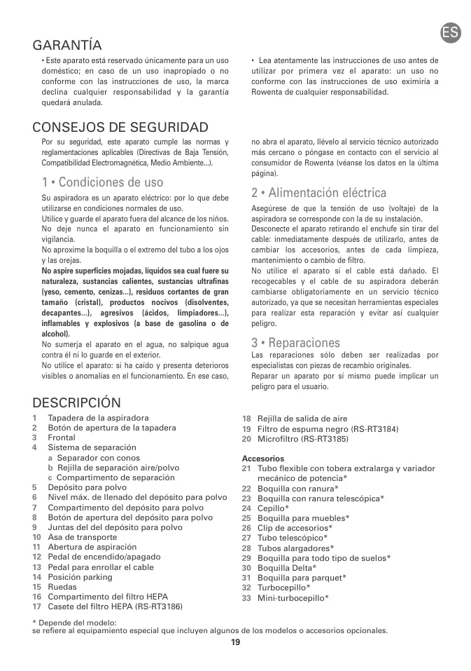 19 Filtro de espuma negro (RS-RT3184) 20 Microfiltro (RS-RT3185) Accesorios 21 Tubo flexible con tobera extralarga y variador mecánico de potencia* 22 Boquilla con ranura* 23 Boquilla con ranura telescópica* 24 Cepillo* 25 Boquilla para muebles* 26 Clip de accesorios* 27 Tubo telescópico* 28 Tubos alargadores* 29 Boquilla para todo tipo de suelos* 30 Boquilla Delta* 31 Boquilla para parquet* 32 Turbocepillo* 33 Mini-turbocepillo*