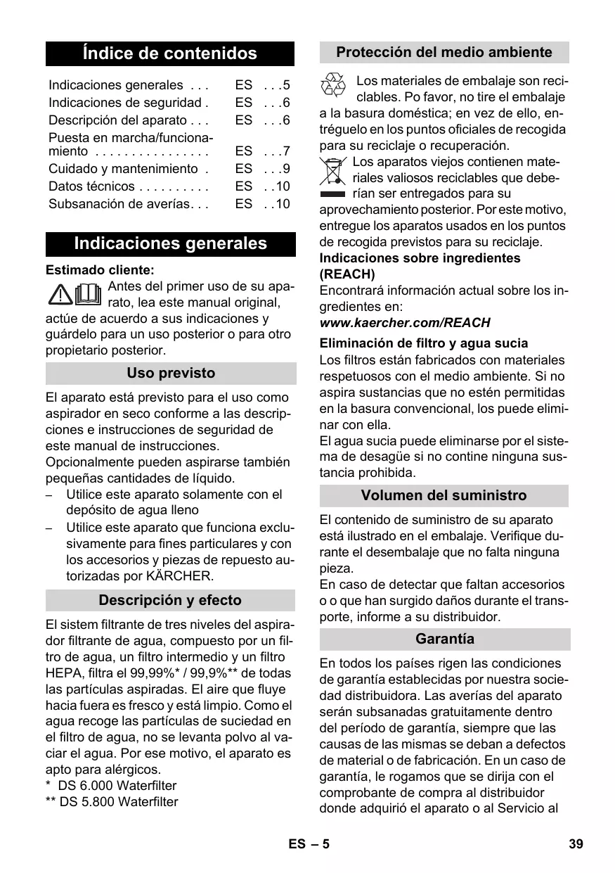 • DS 6.000 Waterfilter ** DS 5.800 Waterfilter Los materiales de embalaje son reciclables. Po favor, no tire el embalaje a la basura doméstica; en vez de ello, entréguelo en los puntos oficiales de recogida para su reciclaje o recuperación. Los aparatos viejos contienen materiales valiosos reciclables que deberían ser entregados para su aprovechamiento posterior. Por este motivo, entregue los aparatos usados en los puntos de recogida previstos para su reciclaje. Indicaciones sobre ingredientes (REACH) Encontrará información actual sobre los ingredientes en: www.kaercher.com/REACH Eliminación de filtro y agua sucia Los filtros están fabricados con materiales respetuosos con el medio ambiente. Si no aspira sustancias que no estén permitidas en la basura convencional, los puede eliminar con ella. El agua sucia puede eliminarse por el sistema de desagüe si no contine ninguna sustancia prohibida. Volumen del suministro El contenido de suministro de su aparato está ilustrado en el embalaje. Verifique durante el desembalaje que no falta ninguna pieza. En caso de detectar que faltan accesorios o o que han surgido daños durante el transporte, informe a su distribuidor. Garantía En todos los países rigen las condiciones de garantía establecidas por nuestra sociedad distribuidora. Las averías del aparato serán subsanadas gratuitamente dentro del período de garantía, siempre que las causas de las mismas se deban a defectos de material o de fabricación. En un caso de garantía, le rogamos que se dirija con el comprobante de compra al distribuidor donde adquirió el aparato o al Servicio al ES – 5