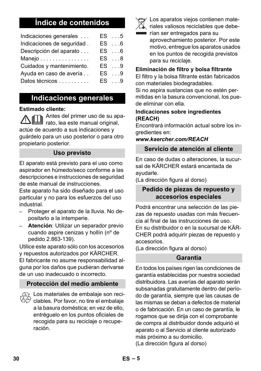 Índice de contenidos Español Indicaciones generales . . . Indicaciones de seguridad . Descripción del aparato . . . Manejo . . . . . . . . . . . . . . . . Cuidados y mantenimiento. Ayuda en caso de avería . . Datos técnicos . . . . . . . . . . Indicaciones generales Estimado cliente: Antes del primer uso de su aparato, lea este manual original, actúe de acuerdo a sus indicaciones y guárdelo para un uso posterior o para otro propietario posterior. Uso previsto El aparato está previsto para el uso como aspirador en húmedo/seco conforme a las descripciones e instrucciones de seguridad de este manual de instrucciones. Este aparato ha sido diseñado para el uso particular y no para los esfuerzos del uso industrial. – Proteger el aparato de la lluvia. No depositarlo a la intemperie. – Atención: Utilizar un separador previo cuando aspire cenizas y hollín (nº de pedido 2.863-139). Utilice este aparato sólo con los accesorios y repuestos autorizados por KÄRCHER. El fabricante no asume responsabilidad alguna por los daños que pudieran derivarse de un uso inadecuado o incorrecto. Protección del medio ambiente Los materiales de embalaje son reciclables. Por favor, no tire el embalaje a la basura doméstica; en vez de ello, entréguelo en los puntos oficiales de recogida para su reciclaje o recuperación.