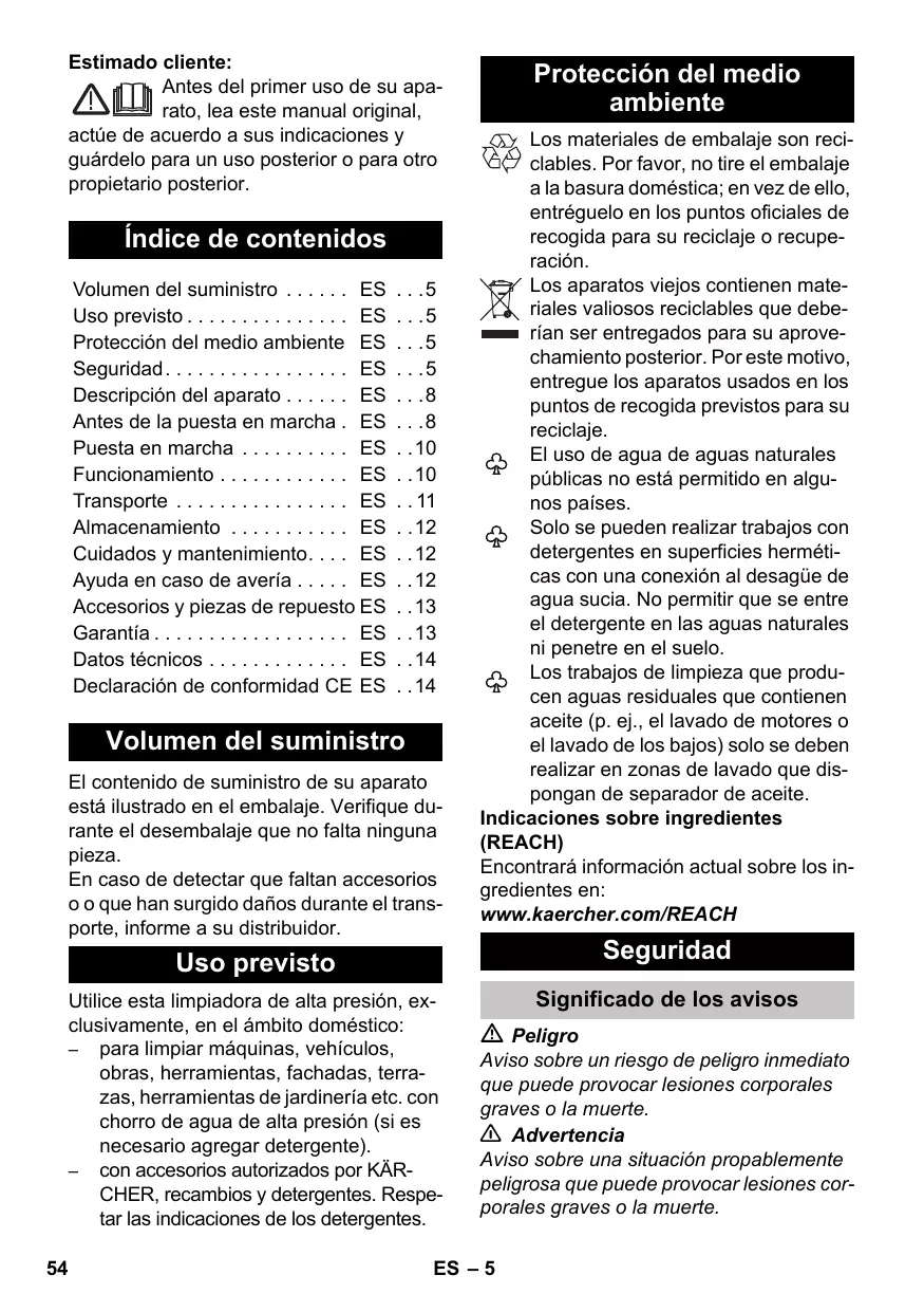 Los materiales de embalaje son reciclables. Por favor, no tire el embalaje a la basura doméstica; en vez de ello, entréguelo en los puntos oficiales de recogida para su reciclaje o recuperación. Los aparatos viejos contienen materiales valiosos reciclables que deberían ser entregados para su aprovechamiento posterior. Por este motivo, entregue los aparatos usados en los puntos de recogida previstos para su reciclaje. El uso de agua de aguas naturales públicas no está permitido en algunos países. Solo se pueden realizar trabajos con detergentes en superficies herméticas con una conexión al desagüe de agua sucia. No permitir que se entre el detergente en las aguas naturales ni penetre en el suelo. Los trabajos de limpieza que producen aguas residuales que contienen aceite (p. ej., el lavado de motores o el lavado de los bajos) solo se deben realizar en zonas de lavado que dispongan de separador de aceite. Indicaciones sobre ingredientes (REACH) Encontrará información actual sobre los ingredientes en: