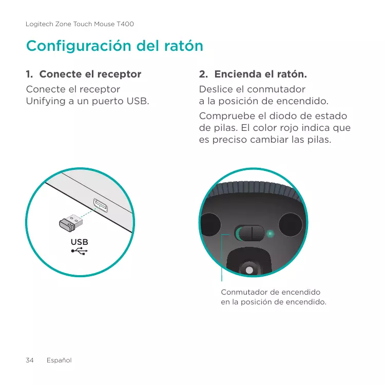 Español Sustituya las pilas Unifying Quite la tapa de las pilas y coloque pilas nuevas en el compartimento. La tecnología Logitech® Unifying conecta hasta seis ratones y teclados Logitech al mismo receptor, con lo que se usa un solo puerto USB para varios dispositivos. Para más información, visite: www.logitech.com/ support/unifying Resolución de problemas ¿Touch Mouse no funciona?