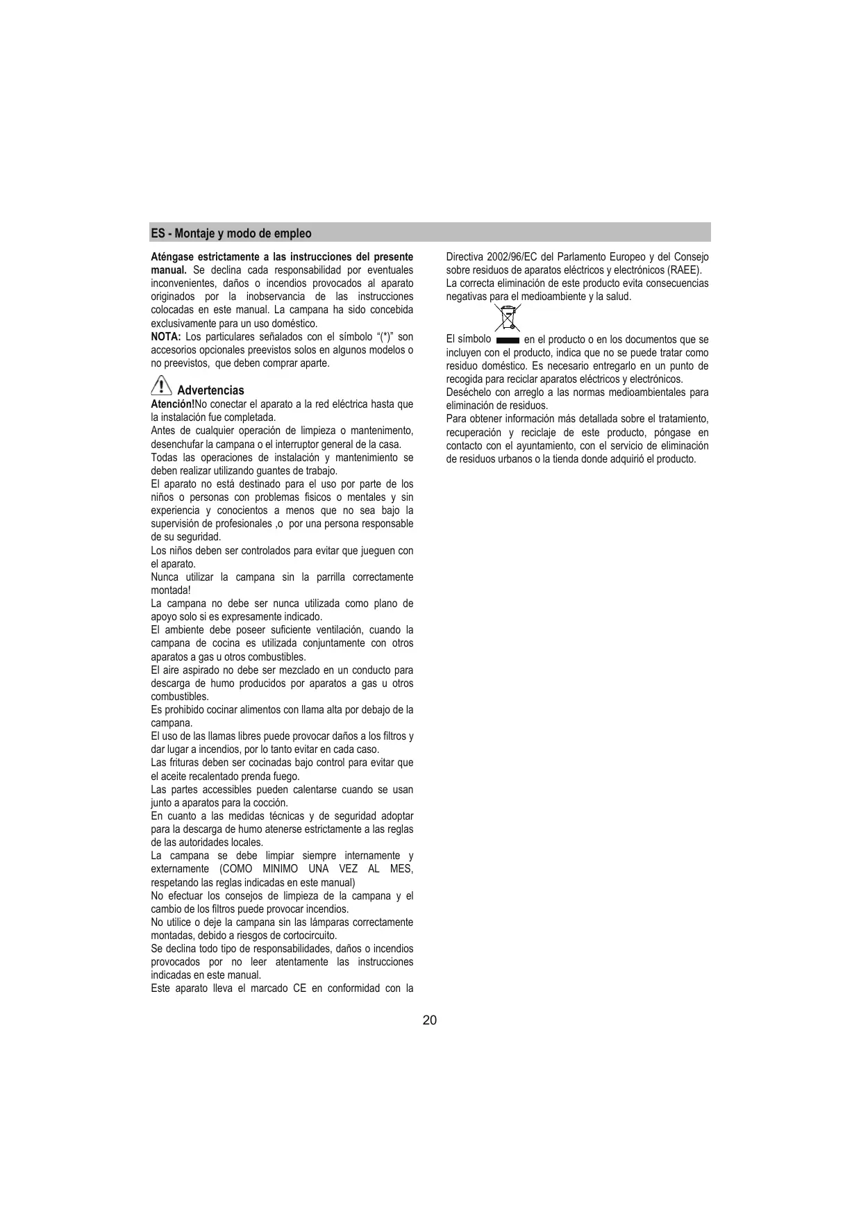 ES - Montaje y modo de empleo Directiva 2002/96/EC del Parlamento Europeo y del Consejo sobre residuos de aparatos eléctricos y electrónicos (RAEE). La correcta eliminación de este producto evita consecuencias negativas para el medioambiente y la salud. Aténgase estrictamente a las instrucciones del presente manual. Se declina cada responsabilidad por eventuales inconvenientes, daños o incendios provocados al aparato originados por la inobservancia de las instrucciones colocadas en este manual. La campana ha sido concebida exclusivamente para un uso doméstico. NOTA: Los particulares señalados con el símbolo “(*)” son accesorios opcionales preevistos solos en algunos modelos o no preevistos, que deben comprar aparte. El símbolo en el producto o en los documentos que se incluyen con el producto, indica que no se puede tratar como residuo doméstico. Es necesario entregarlo en un punto de recogida para reciclar aparatos eléctricos y electrónicos. Deséchelo con arreglo a las normas medioambientales para eliminación de residuos. Para obtener información más detallada sobre el tratamiento, recuperación y reciclaje de este producto, póngase en contacto con el ayuntamiento, con el servicio de eliminación de residuos urbanos o la tienda donde adquirió el producto. Advertencias Atención!No conectar el aparato a la red eléctrica hasta que la instalación fue completada. Antes de cualquier operación de limpieza o mantenimento, desenchufar la campana o el interruptor general de la casa. Todas las operaciones de instalación y mantenimiento se deben realizar utilizando guantes de trabajo. El aparato no está destinado para el uso por parte de los niños o personas con problemas fisicos o mentales y sin experiencia y conocientos a menos que no sea bajo la supervisión de profesionales ,o por una persona responsable de su seguridad. Los niños deben ser controlados para evitar que jueguen con el aparato. Nunca utilizar la campana sin la parrilla correctamente montada! La campana no debe ser nunca utilizada como plano de apoyo solo si es expresamente indicado. El ambiente debe poseer suficiente ventilación, cuando la campana de cocina es utilizada conjuntamente con otros aparatos a gas u otros combustibles. El aire aspirado no debe ser mezclado en un conducto para descarga de humo producidos por aparatos a gas u otros combustibles. Es prohibido cocinar alimentos con llama alta por debajo de la campana. El uso de las llamas libres puede provocar daños a los filtros y dar lugar a incendios, por lo tanto evitar en cada caso. Las frituras deben ser cocinadas bajo control para evitar que el aceite recalentado prenda fuego. Las partes accessibles pueden calentarse cuando se usan junto a aparatos para la cocción. En cuanto a las medidas técnicas y de seguridad adoptar para la descarga de humo atenerse estrictamente a las reglas de las autoridades locales. La campana se debe limpiar siempre internamente y externamente (COMO MINIMO UNA VEZ AL MES, respetando las reglas indicadas en este manual) No efectuar los consejos de limpieza de la campana y el cambio de los filtros puede provocar incendios. No utilice o deje la campana sin las lámparas correctamente montadas, debido a riesgos de cortocircuito. Se declina todo tipo de responsabilidades, daños o incendios provocados por no leer atentamente las instrucciones indicadas en este manual. Este aparato lleva el marcado CE en conformidad con la