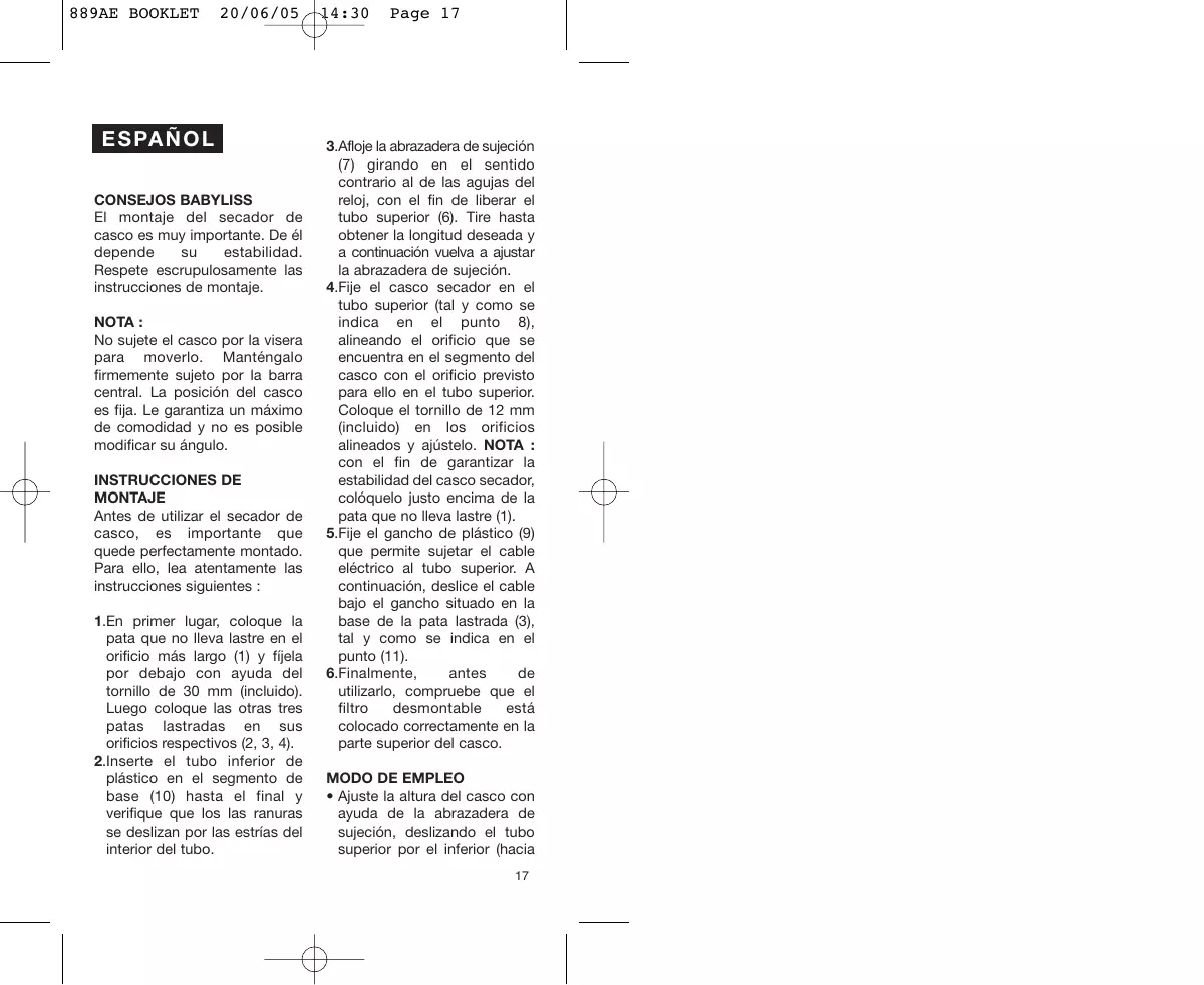 E S PA Ñ O L CONSEJOS BABYLISS El montaje del secador de casco es muy importante. De él depende su estabilidad. Respete escrupulosamente las instrucciones de montaje. NOTA : No sujete el casco por la visera para moverlo. Manténgalo firmemente sujeto por la barra central. La posición del casco es fija. Le garantiza un máximo de comodidad y no es posible modificar su ángulo. INSTRUCCIONES DE MONTAJE Antes de utilizar el secador de casco, es importante que quede perfectamente montado. Para ello, lea atentamente las instrucciones siguientes : 1.En primer lugar, coloque la pata que no lleva lastre en el orificio más largo (1) y fíjela por debajo con ayuda del tornillo de 30 mm (incluido). Luego coloque las otras tres patas lastradas en sus orificios respectivos (2, 3, 4). 2.Inserte el tubo inferior de plástico en el segmento de base (10) hasta el final y verifique que los las ranuras se deslizan por las estrías del interior del tubo.