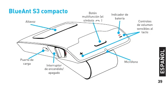 Indicador de batería Controles de volumen sensibles al tacto Micrófono BlueAnt ESPAÑOL BlueAnt S3 compacto