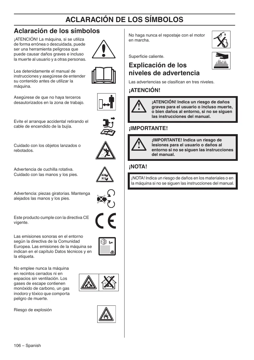 Aclaración de los símbolos ¡ATENCIÓN! La máquina, si se utiliza de forma errónea o descuidada, puede ser una herramienta peligrosa que puede causar daños graves e incluso la muerte al usuario y a otras personas. Lea detenidamente el manual de instrucciones y asegúrese de entender su contenido antes de utilizar la máquina. Asegúrese de que no haya terceros desautorizados en la zona de trabajo. Evite el arranque accidental retirando el cable de encendido de la bujía. Cuidado con los objetos lanzados o rebotados. Advertencia de cuchilla rotativa. Cuidado con las manos y los pies. Advertencia: piezas giratorias. Mantenga alejados las manos y los pies. Este producto cumple con la directiva CE vigente. Las emisiones sonoras en el entorno según la directiva de la Comunidad Europea. Las emisiones de la máquina se indican en el capítulo Datos técnicos y en la etiqueta. No emplee nunca la máquina en recintos cerrados ni en espacios sin ventilación. Los gases de escape contienen monóxido de carbono, un gas inodoro y tóxico que comporta peligro de muerte. Riesgo de explosión 106 – Spanish No haga nunca el repostaje con el motor en marcha. Superficie caliente. Explicación de los niveles de advertencia Las advertencias se clasifican en tres niveles. ¡ATENCIÓN!