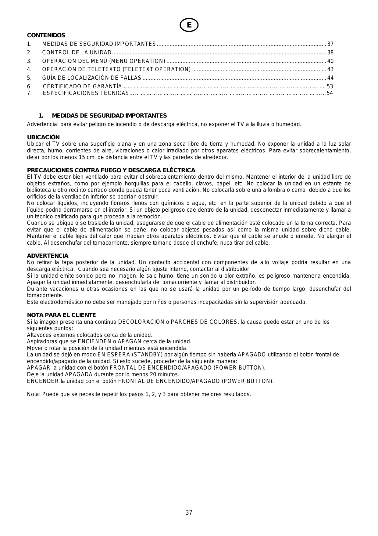 Advertencia: para evitar peligro de incendio o de descarga eléctrica, no exponer el TV a la lluvia o humedad. UBICACIÓN Ubicar el TV sobre una superficie plana y en una zona seca libre de tierra y humedad. No exponer la unidad a la luz solar directa, humo, corrientes de aire, vibraciones o calor irradiado por otros aparatos eléctricos. Para evitar sobrecalentamiento, dejar por los menos 15 cm. de distancia entre el TV y las paredes de alrededor. PRECAUCIONES CONTRA FUEGO Y DESCARGA ELÉCTRICA El TV debe estar bien ventilado para evitar el sobrecalentamiento dentro del mismo. Mantener el interior de la unidad libre de objetos extraños, como por ejemplo horquillas para el cabello, clavos, papel, etc. No colocar la unidad en un estante de biblioteca u otro recinto cerrado donde pueda tener poca ventilación. No colocarla sobre una alfombra o cama debido a que los orificios de la ventilación inferior se podrían obstruir. No colocar líquidos, incluyendo floreros llenos con químicos o agua, etc. en la parte superior de la unidad debido a que el líquido podría derramarse en el interior. Si un objeto peligroso cae dentro de la unidad, desconectar inmediatamente y llamar a un técnico calificado para que proceda a la remoción. Cuando se ubique o se traslade la unidad, asegurarse de que el cable de alimentación esté colocado en la toma correcta. Para evitar que el cable de alimentación se dañe, no colocar objetos pesados así como la misma unidad sobre dicho cable. Mantener el cable lejos del calor que irradian otros aparatos eléctricos. Evitar que el cable se anude o enrede. No alargar el cable. Al desenchufar del tomacorriente, siempre tomarlo desde el enchufe, nuca tirar del cable. ADVERTENCIA No retirar la tapa posterior de la unidad. Un contacto accidental con componentes de alto voltaje podría resultar en una descarga eléctrica. Cuando sea necesario algún ajuste interno, contactar al distribuidor. Si la unidad emite sonido pero no imagen, le sale humo, tiene un sonido u olor extraño, es peligroso mantenerla encendida. Apagar la unidad inmediatamente, desenchufarla del tomacorriente y llamar al distribuidor. Durante vacaciones u otras ocasiones en las que no se usará la unidad por un período de tiempo largo, desenchufar del tomacorriente. Este electrodoméstico no debe ser manejado por niños o personas incapacitadas sin la supervisión adecuada.