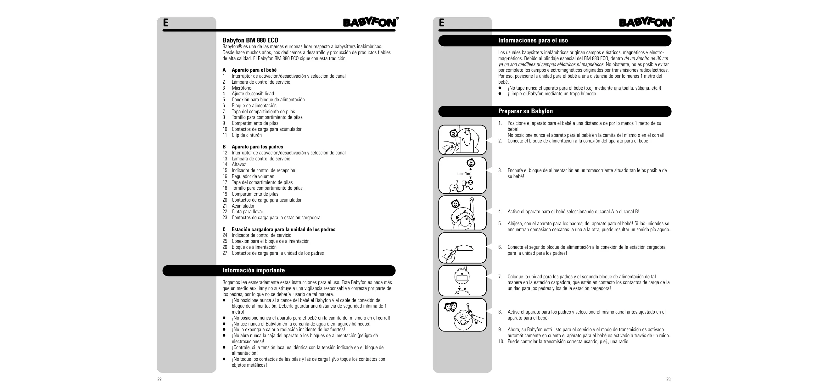Informaciones para el uso Babyfon® es una de las marcas europeas líder respecto a babysitters inalámbricos. Desde hace muchos años, nos dedicamos a desarrollo y producción de productos fiables de alta calidad. El Babyfon BM 880 ECO sigue con esta tradición. Información importante Rogamos lea esmeradamente estas instrucciones para el uso. Este Babyfon es nada más que un medio auxiliar y no sustituye a una vigilancia responsable y correcta por parte de los padres, por lo que no se debería usarlo de tal manera. ● ¡No posicione nunca al alcance del bebé el Babyfon y el cable de conexión del bloque de alimentación. Debería guardar una distancia de seguridad mínima de 1 metro! ● ¡No posicione nunca el aparato para el bebé en la camita del mismo o en el corral! ● ¡No use nunca el Babyfon en la cercanía de agua o en lugares húmedos! ● ¡No lo exponga a calor o radiación incidente de luz fuertes! ● ¡No abra nunca la caja del aparato o los bloques de alimentación (peligro de electrocuciones)! ● ¡Controle, si la tensión local es idéntica con la tensión indicada en el bloque de alimentación! ● ¡No toque los contactos de las pilas y las de carga! ¡No toque los contactos con objetos metálicos!