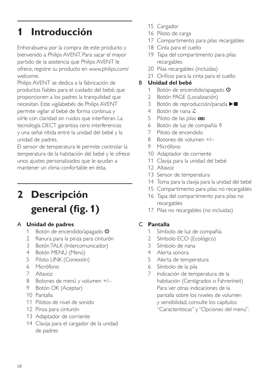 1 Introducción Enhorabuena por la compra de este producto y bienvenido a Philips AVENT. Para sacar el mayor partido de la asistencia que Philips AVENT le ofrece, registre su producto en www.philips.com/ welcome. Philips AVENT se dedica a la fabricación de productos fiables para el cuidado del bebé, que proporcionen a los padres la tranquilidad que necesitan. Este vigilabebés de Philips AVENT permite vigilar al bebé de forma continua y oírle con claridad sin ruidos que interfieran. La tecnología DECT garantiza cero interferencias y una señal nítida entre la unidad del bebé y la unidad de padres. El sensor de temperatura le permite controlar la temperatura de la habitación del bebé y le ofrece unos ajustes personalizados que le ayudan a mantener un clima confortable en ésta. 2 Descripción general (fig. 1) A Unidad de padres 1 Botón de encendido/apagado 3 2 Ranura para la pinza para cinturón 3 Botón TALK (Intercomunicador) 4 Botón MENU (Menú) 5 Piloto LINK (Conexión) 6 Micrófono 7 Altavoz 8 Botones de menú y volumen +/– 9 Botón OK (Aceptar) 10 Pantalla 11 Pilotos de nivel de sonido 12 Pinza para cinturón 13 Adaptador de corriente 14 Clavija para el cargador de la unidad de padres