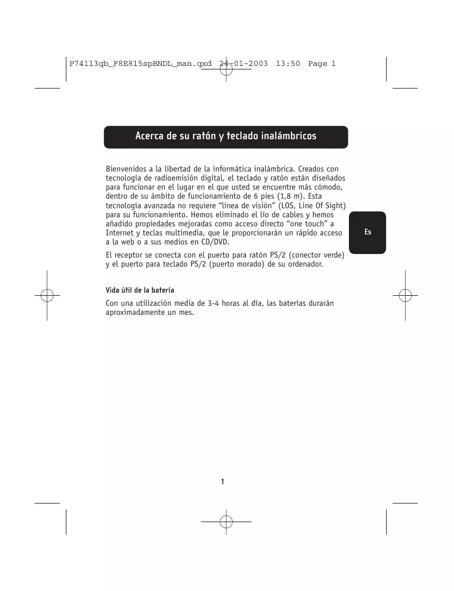 Acerca de su ratón y teclado inalámbricos Bienvenidos a la libertad de la informática inalámbrica. Creados con tecnología de radioemisión digital, el teclado y ratón están diseñados para funcionar en el lugar en el que usted se encuentre más cómodo, dentro de su ámbito de funcionamiento de 6 pies (1,8 m). Esta tecnología avanzada no requiere “línea de visión” (LOS, Line Of Sight) para su funcionamiento. Hemos eliminado el lío de cables y hemos añadido propiedades mejoradas como acceso directo “one touch” a Internet y teclas multimedia, que le proporcionarán un rápido acceso a la web o a sus medios en CD/DVD. El receptor se conecta con el puerto para ratón PS/2 (conector verde) y el puerto para teclado PS/2 (puerto morado) de su ordenador. Vida útil de la batería Con una utilización media de 3-4 horas al día, las baterías durarán aproximadamente un mes.
