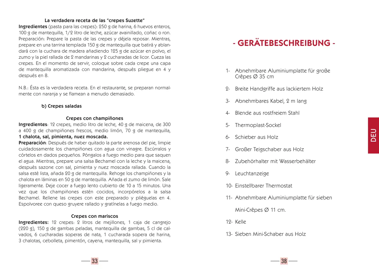 La verdadera receta de las “crepes Suzette” Ingredientes (pasta para las crepes): 250 g de harina, 6 huevos enteros, 100 g de mantequilla, 1/2 litro de leche, azúcar avainillado, coñac o ron. Preparación: Prepare la pasta de las crepes y déjela reposar. Mientras, prepare en una tarrina templada 150 g de mantequilla que batirá y ablandará con la cuchara de madera añadiendo 125 g de azúcar en polvo, el zumo y la piel rallada de 2 mandarinas y 2 cucharadas de licor. Cueza las crepes. En el momento de servir, coloque sobre cada crepe una capa de mantequilla aromatizada con mandarina, después pliegue en 4 y después en 8. N.B.: Ésta es la verdadera receta. En el restaurante, se preparan normalmente con naranja y se flamean a menudo demasiado. - GERÄTEBESCHREIBUNG - b) Crepes saladas Crepes con champiñones Ingredientes: 12 crepes, medio litro de leche, 40 g de maicena, de 300 a 400 g de champiñones frescos, medio limón, 70 g de mantequilla, 1 chalota, sal, pimienta, nuez moscada. Preparación: Después de haber quitado la parte arenosa del pie, limpie cuidadosamente los champiñones con agua con vinagre. Escúrralos y córtelos en dados pequeños. Póngalos a fuego medio para que saquen el agua. Mientras, prepare una salsa Bechamel con la leche y la maicena, después sazone con sal, pimienta y nuez moscada rallada. Cuando la salsa esté lista, añada 20 g de mantequilla. Rehoge los champiñones y la chalota en láminas en 50 g de mantequilla. Añada el zumo de limón. Sale ligeramente. Deje cocer a fuego lento cubierto de 10 a 15 minutos. Una vez que los champiñones estén cocidos, incorpórelos a la salsa Bechamel. Rellene las crepes con este preparado y pliéguelas en 4. Espolvoree con queso gruyere rallado y gratínelas a fuego medio. Crepes con mariscos Ingredientes: 12 crepes: 2 litros de mejillones, 1 caja de cangrejo (220 g), 150 g de gambas peladas, mantequilla de gambas, 5 cl de calvados, 6 cucharadas soperas de nata, 1 cucharada sopera de harina, 3 chalotas, cebolleta, pimentón, cayena, mantequilla, sal y pimienta.