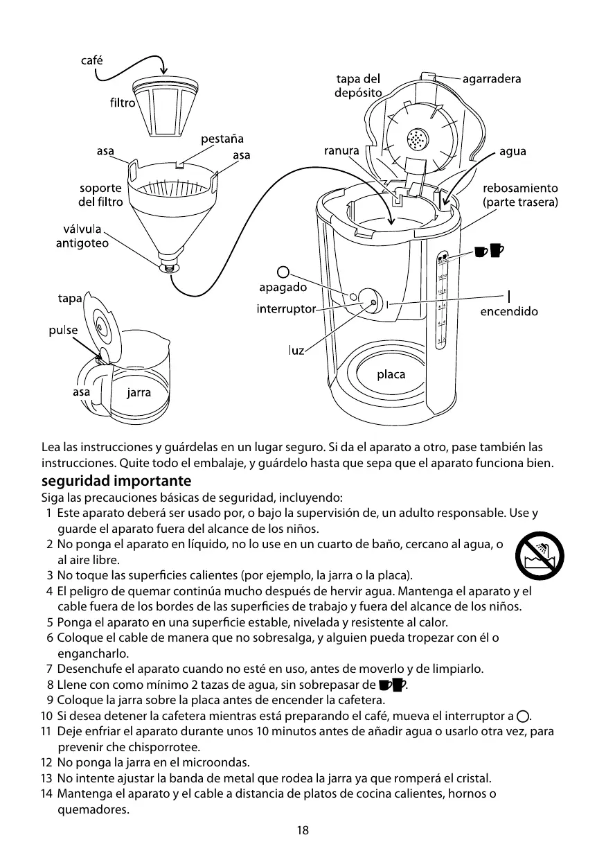 Siga las precauciones básicas de seguridad, incluyendo: 1 Este aparato deberá ser usado por, o bajo la supervisión de, un adulto responsable. Use y guarde el aparato fuera del alcance de los niños. 2 No ponga el aparato en líquido, no lo use en un cuarto de baño, cercano al agua, o al aire libre. 3 No toque las superficies calientes (por ejemplo, la jarra o la placa). 4 El peligro de quemar continúa mucho después de hervir agua. Mantenga el aparato y el cable fuera de los bordes de las superficies de trabajo y fuera del alcance de los niños. 5 Ponga el aparato en una superficie estable, nivelada y resistente al calor. 6 Coloque el cable de manera que no sobresalga, y alguien pueda tropezar con él o engancharlo. 7 Desenchufe el aparato cuando no esté en uso, antes de moverlo y de limpiarlo. 8 Llene con como mínimo 2 tazas de agua, sin sobrepasar de ;:. 9 Coloque la jarra sobre la placa antes de encender la cafetera. 10 Si desea detener la cafetera mientras está preparando el café, mueva el interruptor a 0. 11 Deje enfriar el aparato durante unos 10 minutos antes de añadir agua o usarlo otra vez, para prevenir che chisporrotee. 12 No ponga la jarra en el microondas. 13 No intente ajustar la banda de metal que rodea la jarra ya que romperá el cristal. 14 Mantenga el aparato y el cable a distancia de platos de cocina calientes, hornos o quemadores. 18