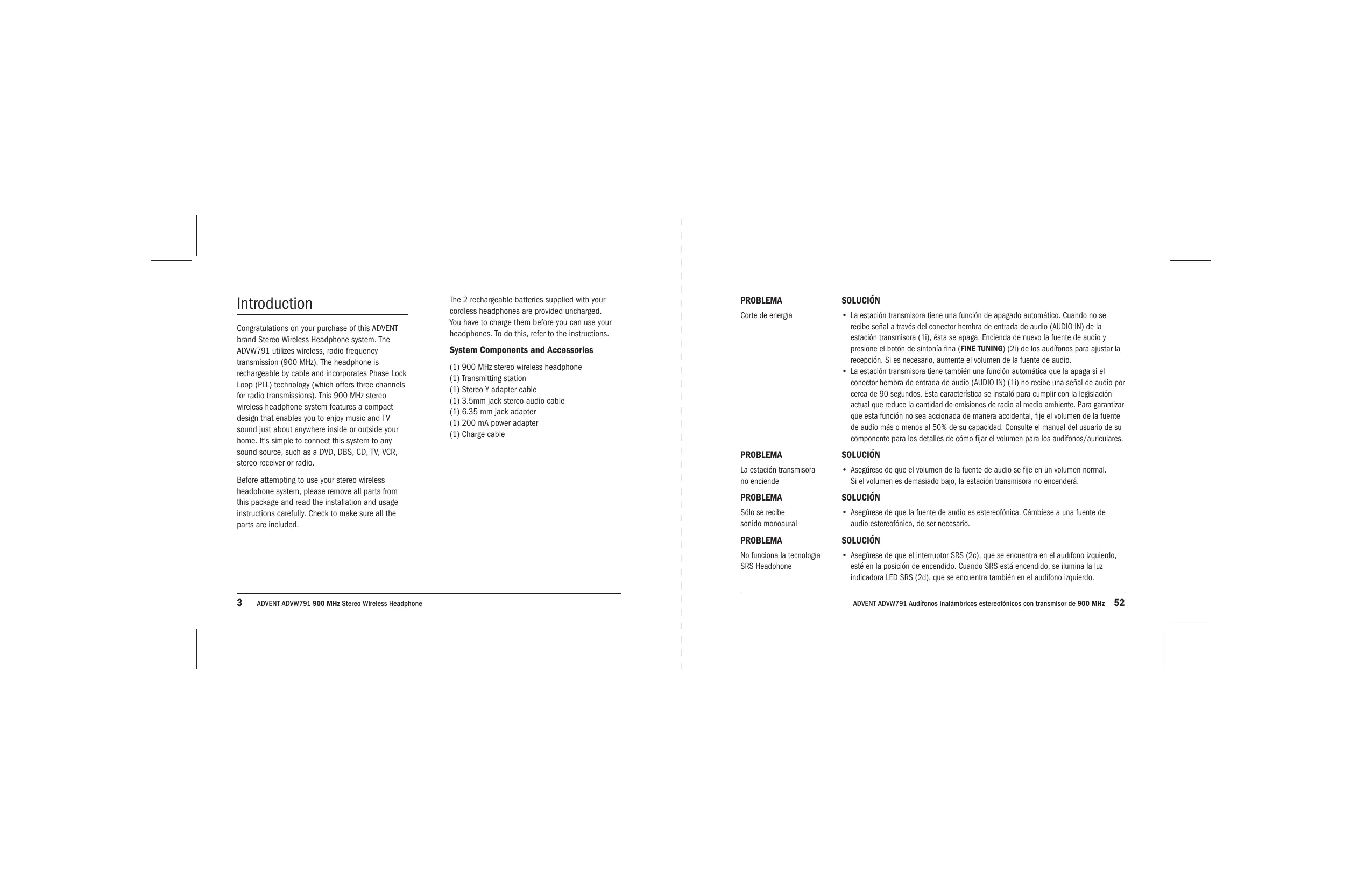 Introducción Felicitaciones por haber comprado este sistema de audífonos inalámbricos estereofónicos de marca ADVENT. El sistema ADVW791 utiliza transmisión de radiofrecuencia inalámbrica (900 MHz). Los audífonos se pueden recargar con cable e incorporan la tecnología Phase Lock Loop (PLL) (que ofrece tres canales para transmisiones de señales de radio) y la tecnología SRS Headphone (que produce tonos enriquecidos y una calidad de sonido más amplia). Este sistema de audífonos inalámbricos estereofónicos de 900 MHz cuenta con un diseño compacto que le permite disfrutar sonido de música y televisión casi en cualquier lugar, dentro o fuera de su casa. Es simple conectar este sistema a cualquier fuente de sonido, como DVD, DBS, CD, TV, VCR, receptor estereofónico o radio. Las dos baterías recargables que se proporcionan con sus audífonos inalámbricos se entregan sin carga. Tiene que cargarlas antes de poder usar sus audífonos. Para hacerlo, consulte las instrucciones. Componentes y accesorios del sistema (1) Audífonos inalámbricos estereofónicos de 900 MHz (1) Estación transmisora (1) Cable adaptador Y estereofónico (1) Cable de audio estereofónico hembra de 3.5 mm (1) Adaptador hembra de 6.35 mm (1) Adaptador de corriente de 200 mA (1) Cable de carga Antes de intentar usar su sistema de audífonos inalámbricos estereofónicos, saque todas las partes de este paquete y lea las instrucciones de instalación y uso detenidamente. Asegúrese de que todas las partes estén incluidas. Specifications Power Supply ADVENT ADVW791 Audífonos inalámbricos estereofónicos con transmisor de 900 MHz