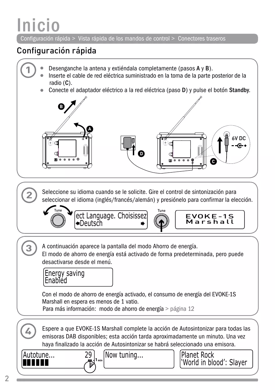 Enabled Con el modo de ahorro de energía activado, el consumo de energía del EVOKE-1S Marshall en espera es menos de 1 vatio. Para más información: modo de ahorro de energía > página 12 Espere a que EVOKE-1S Marshall complete la acción de Autosintonizar para todas las emisoras DAB disponibles; esta acción tarda aproximadamente un minuto. Una vez haya finalizado la acción de Autosintonizar se habrá seleccionado una emisora.