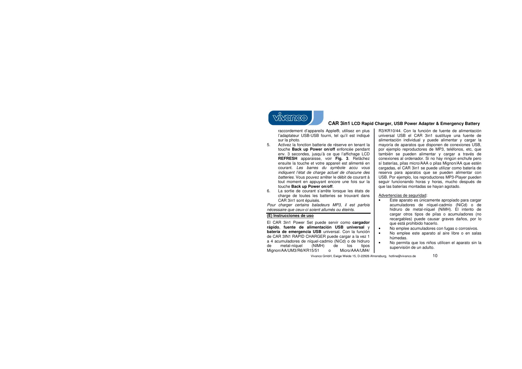 Encuentra gratis el manual del aparato USB POWER ADAPTER & EMERGENCY BATTERY VIVANCO en formato PDF.