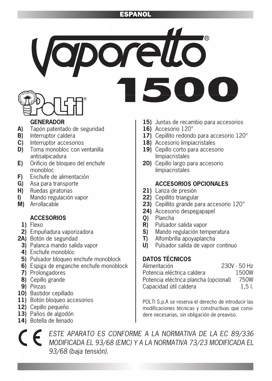 Encuentra gratis el manual del aparato 1500 VAPORETTO en formato PDF.