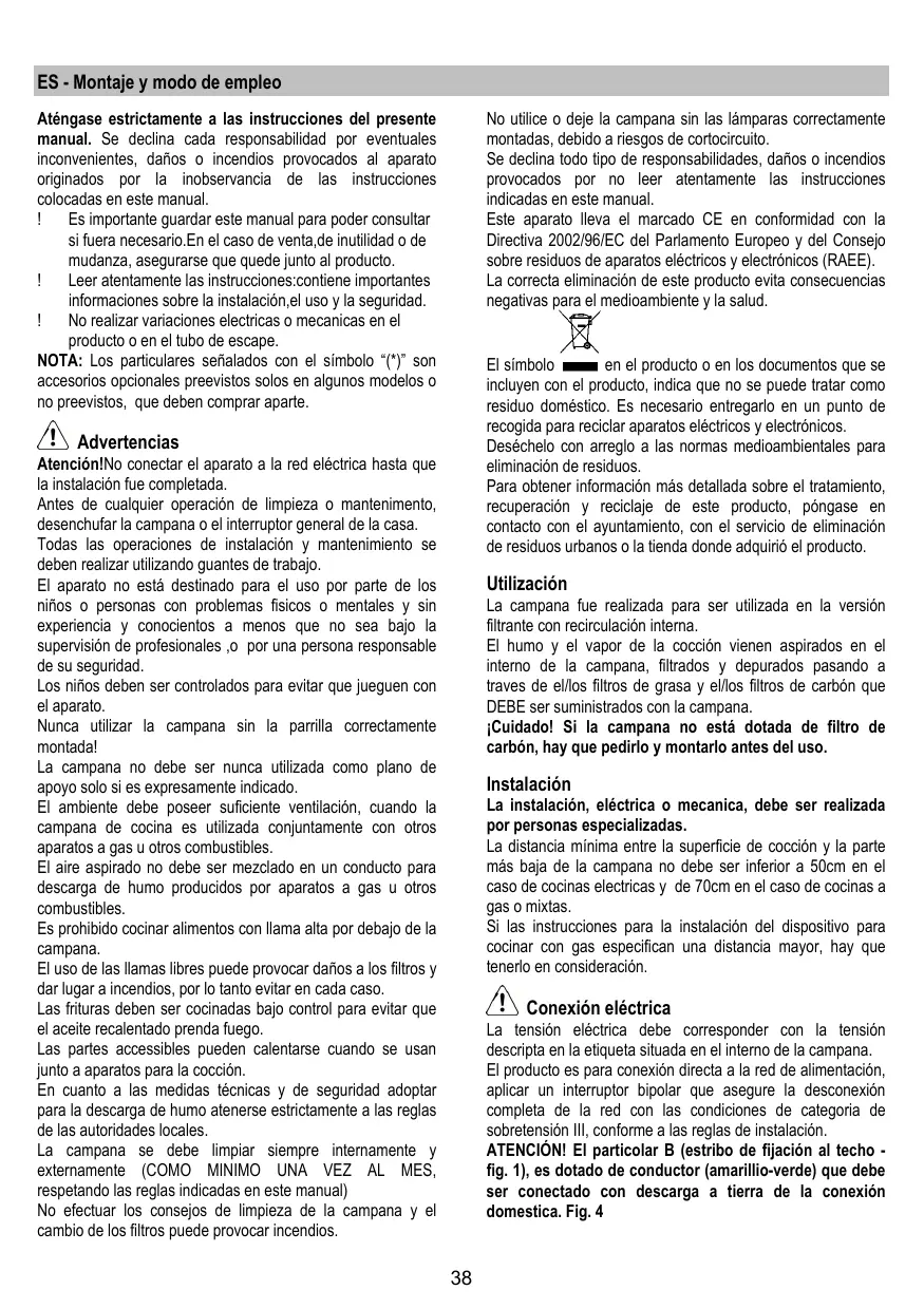 El ambiente depebe poseer suficiente ventilacion, cuando la campana de cocina esutilizada conjuntamente conothers aparatos a gas uothers combustibles.