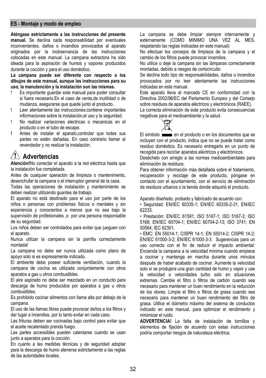 ES - Montaje y modo de empleo La campana se debe limpiar siempre internamente y externamente (COMO MINIMO UNA VEZ AL MES, respetando las reglas indicadas en este manual) No efectuar los consejos de limpieza de la campana y el cambio de los filtros puede provocar incendios. No utilice o deje la campana sin las lámparas correctamente montadas, debido a riesgos de cortocircuito. Se declina todo tipo de responsabilidades, daños o incendios provocados por no leer atentamente las instrucciones indicadas en este manual. Este aparato lleva el marcado CE en conformidad con la Directiva 2002/96/EC del Parlamento Europeo y del Consejo sobre residuos de aparatos eléctricos y electrónicos (RAEE). La correcta eliminación de este producto evita consecuencias negativas para el medioambiente y la salud. Aténgase estrictamente a las instrucciones del presente manual. Se declina cada responsabilidad por eventuales inconvenientes, daños o incendios provocados al aparato originados por la inobservancia de las instrucciones colocadas en este manual. La campana extractora ha sido ideada para la aspiración de humos y vapores producidos durante la cocción y para el uso doméstico. La campana puede ser diferente con respecto a los dibujos de este manual, aunque las instrucciones para su uso, la manutención y la instalación son las mismas. Es importante guardar este manual para poder consultar si fuera necesario.En el caso de venta,de inutilidad o de mudanza, asegurarse que quede junto al producto. Leer atentamente las instrucciones:contiene importantes informaciones sobre la instalación,el uso y la seguridad. No realizar variaciones electricas o mecanicas en el producto o en el tubo de escape. Antes de instalar el aparato,controlar que todas sus partes no estèn dañadas. En caso contrario llamar al revendedor y no realizar la instalaciòn. El símbolo en el producto o en los documentos que se incluyen con el producto, indica que no se puede tratar como residuo doméstico. Es necesario entregarlo en un punto de recogida para reciclar aparatos eléctricos y electrónicos. Deséchelo con arreglo a las normas medioambientales para eliminación de residuos. Para obtener información más detallada sobre el tratamiento, recuperación y reciclaje de este producto, póngase en contacto con el ayuntamiento, con el servicio de eliminación de residuos urbanos o la tienda donde adquirió el producto. Advertencias Atención!No conectar el aparato a la red eléctrica hasta que la instalación fue completada. Antes de cualquier operación de limpieza o mantenimento, desenchufar la campana o el interruptor general de la casa. Todas las operaciones de instalación y mantenimiento se deben realizar utilizando guantes de trabajo. El aparato no está destinado para el uso por parte de los niños o personas con problemas fisicos o mentales y sin experiencia y conocientos a menos que no sea bajo la supervisión de profesionales ,o por una persona responsable de su seguridad. Los niños deben ser controlados para evitar que jueguen con el aparato. Nunca utilizar la campana sin la parrilla correctamente montada! La campana no debe ser nunca utilizada como plano de apoyo solo si es expresamente indicado. El ambiente debe poseer suficiente ventilación, cuando la campana de cocina es utilizada conjuntamente con otros aparatos a gas u otros combustibles. El aire aspirado no debe ser mezclado en un conducto para descarga de humo producidos por aparatos a gas u otros combustibles. Es prohibido cocinar alimentos con llama alta por debajo de la campana. El uso de las llamas libres puede provocar daños a los filtros y dar lugar a incendios, por lo tanto evitar en cada caso. Las frituras deben ser cocinadas bajo control para evitar que el aceite recalentado prenda fuego. Las partes accessibles pueden calentarse cuando se usan junto a aparatos para la cocción. En cuanto a las medidas técnicas y de seguridad adoptar para la descarga de humo atenerse estrictamente a las reglas de las autoridades locales. Aparato diseñado, probado y fabricado de acuerdo con: