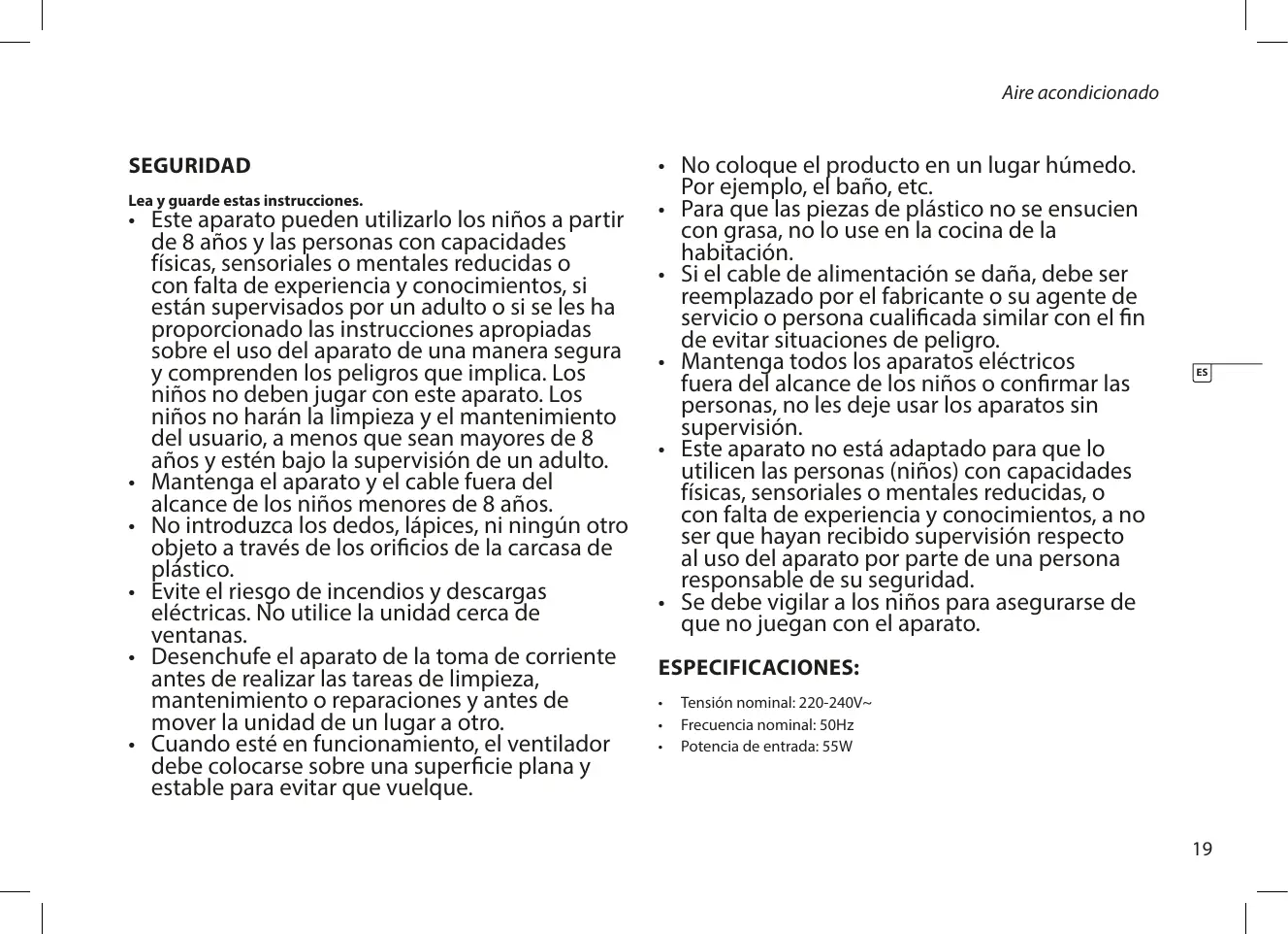 Tensión nominal: 220-240V~ Frecuencia nominal: 50Hz Potencia de entrada: 55W