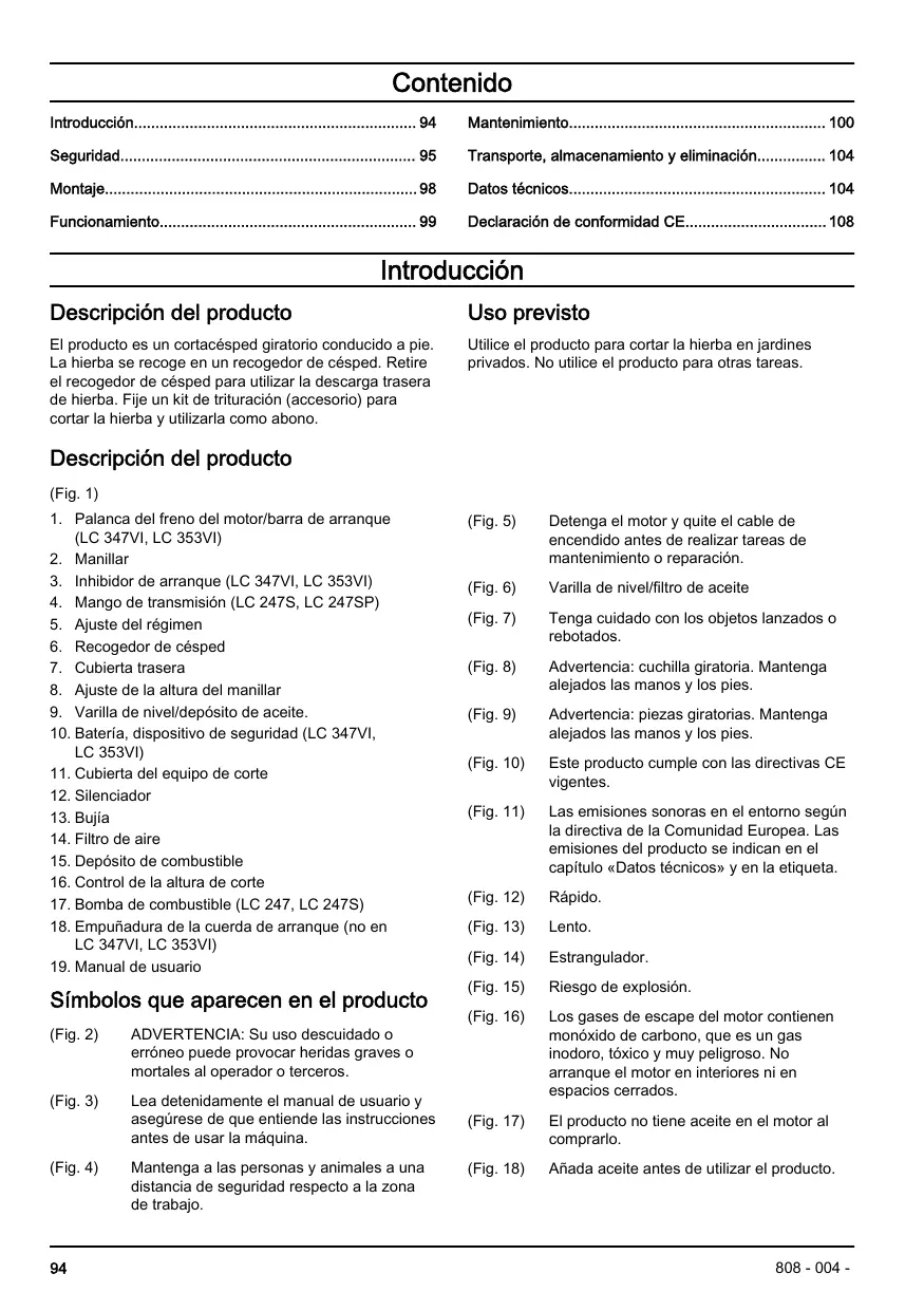 (Fig. 1) 1. Palanca del freno del motor/barra de arranque (LC 347VI, LC 353VI) 2. Manillar 3. Inhibidor de arranque (LC 347VI, LC 353VI) 4. Mango de transmisión (LC 247S, LC 247SP) 5. Ajuste del régimen 6. Recogedor de césped 7. Cubierta trasera 8. Ajuste de la altura del manillar 9. Varilla de nivel/depósito de aceite. 10. Batería, dispositivo de seguridad (LC 347VI, LC 353VI) 11. Cubierta del equipo de corte 12. Silenciador 13. Bujía 14. Filtro de aire 15. Depósito de combustible 16. Control de la altura de corte 17. Bomba de combustible (LC 247, LC 247S) 18. Empuñadura de la cuerda de arranque (no en LC 347VI, LC 353VI) 19. Manual de usuario