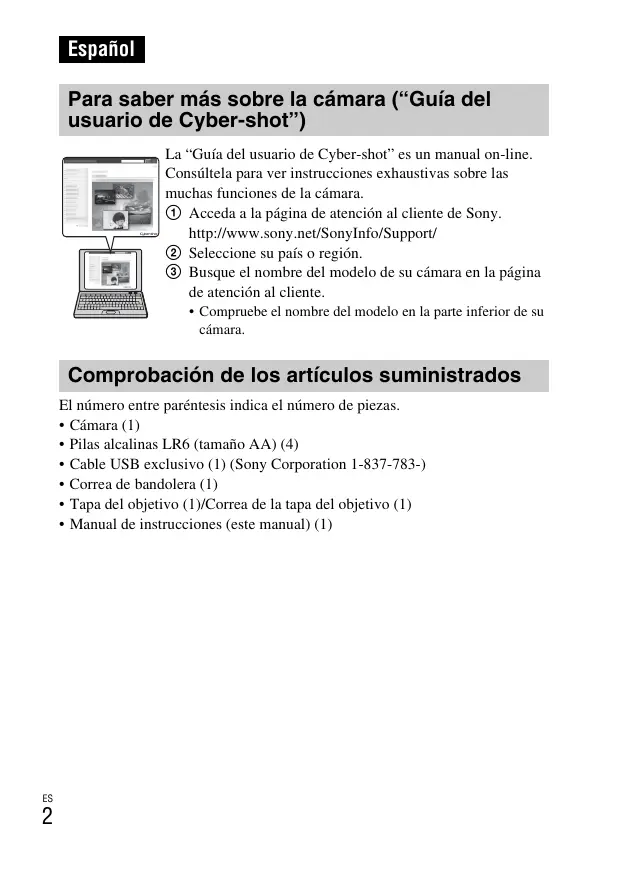 El número entre paréntesis indica el número de piezas. • Cámara (1) • Pilas alcalinas LR6 (tamaño AA) (4) • Cable USB exclusivo (1) (Sony Corporation 1-837-783-) • Correa de bandolera (1) • Tapa del objetivo (1)/Correa de la tapa del objetivo (1) • Manual de instrucciones (este manual) (1)