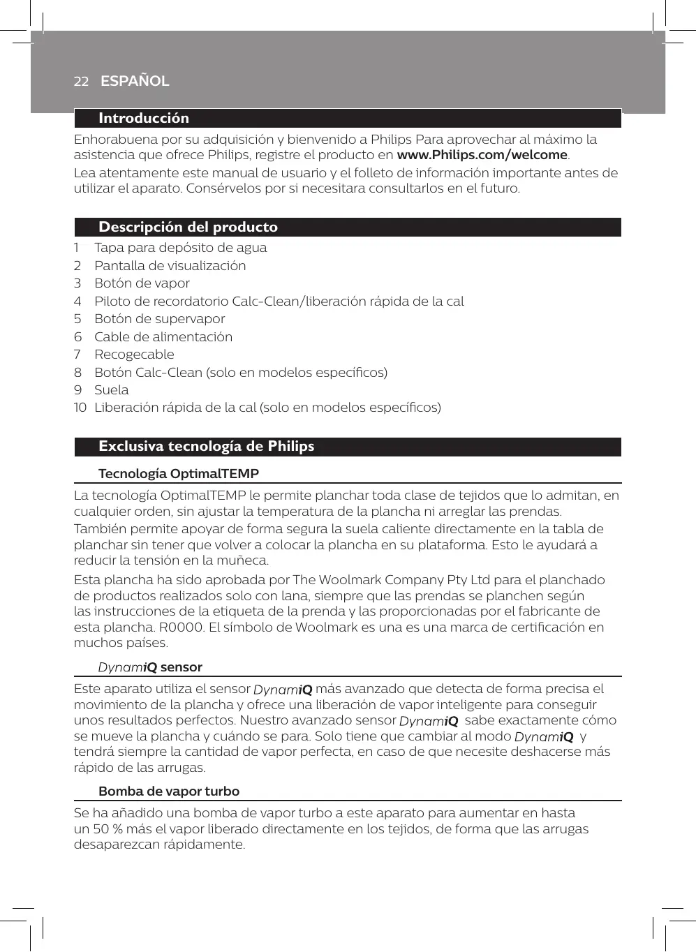 Tecnología OptimalTEMP La tecnología OptimalTEMP le permite planchar toda clase de tejidos que lo admitan, en cualquier orden, sin ajustar la temperatura de la plancha ni arreglar las prendas. También permite apoyar de forma segura la suela caliente directamente en la tabla de planchar sin tener que volver a colocar la plancha en su plataforma. Esto le ayudará a reducir la tensión en la muñeca. Esta plancha ha sido aprobada por The Woolmark Company Pty Ltd para el planchado de productos realizados solo con lana, siempre que las prendas se planchen según las instrucciones de la etiqueta de la prenda y las proporcionadas por el fabricante de esta plancha. R0000. El símbolo de Woolmark es una es una marca de certificación en muchos países. sensor Este aparato utiliza el sensor más avanzado que detecta de forma precisa el movimiento de la plancha y ofrece una liberación de vapor inteligente para conseguir unos resultados perfectos. Nuestro avanzado sensor sabe exactamente cómo se mueve la plancha y cuándo se para. Solo tiene que cambiar al modo y tendrá siempre la cantidad de vapor perfecta, en caso de que necesite deshacerse más rápido de las arrugas. Bomba de vapor turbo Se ha añadido una bomba de vapor turbo a este aparato para aumentar en hasta un 50 % más el vapor liberado directamente en los tejidos, de forma que las arrugas desaparezcan rápidamente.