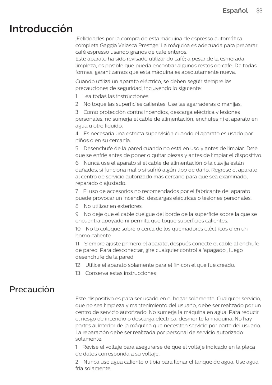 ¡Felicidades por la compra de esta máquina de espresso automática completa Gaggia Velasca Prestige! La máquina es adecuada para preparar café espresso usando granos de café enteros. Este aparato ha sido revisado utilizando café; a pesar de la esmerada limpieza, es posible que pueda encontrar algunos restos de café. De todas formas, garantizamos que esta máquina es absolutamente nueva. Cuando utiliza un aparato eléctrico, se deben seguir siempre las precauciones de seguridad, incluyendo lo siguiente: 1