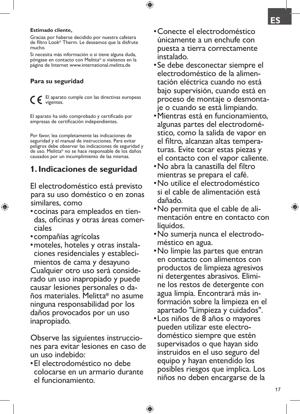 - El electrodoméstico no debe posibles riesgos que implica. Los colocarse en un armario durante niños no deben encargarse de la el funcionamiento. Estimado cliente, Gracias por haberse decidido por nuestra cafetera de filtro Look® Therm. Le deseamos que la disfrute mucho. Si necesita más información o si tiene alguna duda, póngase en contacto con Melitta® o visítenos en la página de Internet www.international.melitta.de