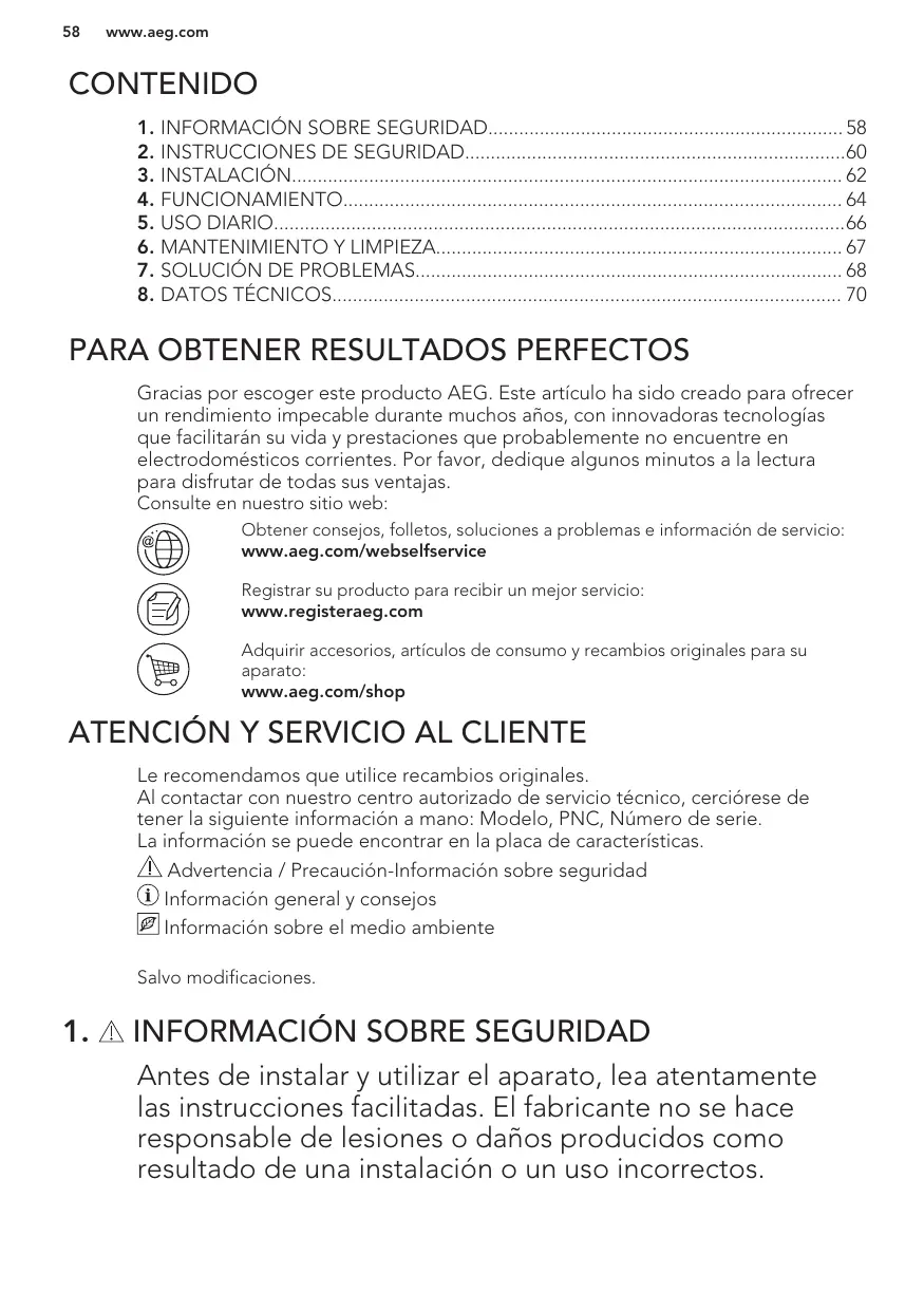 Gracias por escoger este producto AEG. Este artículo ha sido creado para ofrecer un rendimiento impecable durante muchos años, con innovadoras tecnologías que facilitarán su vida y prestaciones que probablemente no encuentre en electrodomésticos corrientes. Por favor, dedique algunos minutos a la lectura para disfrutar de todas sus ventajas. Consulte en nuestro sitio web: Obtener consejos, folletos, soluciones a problemas e información de servicio: www.aeg.com/webselfservice Registrar su producto para recibir un mejor servicio: www.registeraeg.com Adquirir accesorios, artículos de consumo y recambios originales para su aparato: www.aeg.com/shop