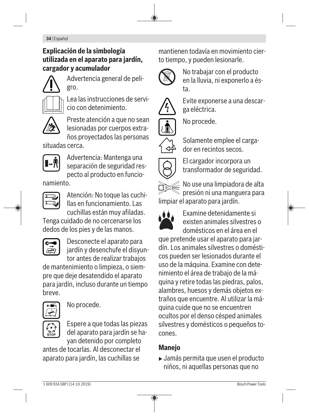 No trabajar con el producto en la lluvia, ni exponerlo a ésta. Evite exponerse a una descarga eléctrica. No procede. Solamente emplee el cargador en recintos secos. El cargador incorpora un transformador de seguridad. No use una limpiadora de alta presión ni una manguera para limpiar el aparato para jardín. Examine detenidamente si existen animales silvestres o domésticos en el área en el que pretende usar el aparato para jardín. Los animales silvestres o domésticos pueden ser lesionados durante el uso de la máquina. Examine con detenimiento el área de trabajo de la máquina y retire todas las piedras, palos, alambres, huesos y demás objetos extraños que encuentre. Al utilizar la máquina cuide que no se encuentren ocultos por el denso césped animales silvestres y domésticos o pequeños tocones. Manejo u Jamás permita que usen el producto niños, ni aquellas personas que no Bosch Power Tools