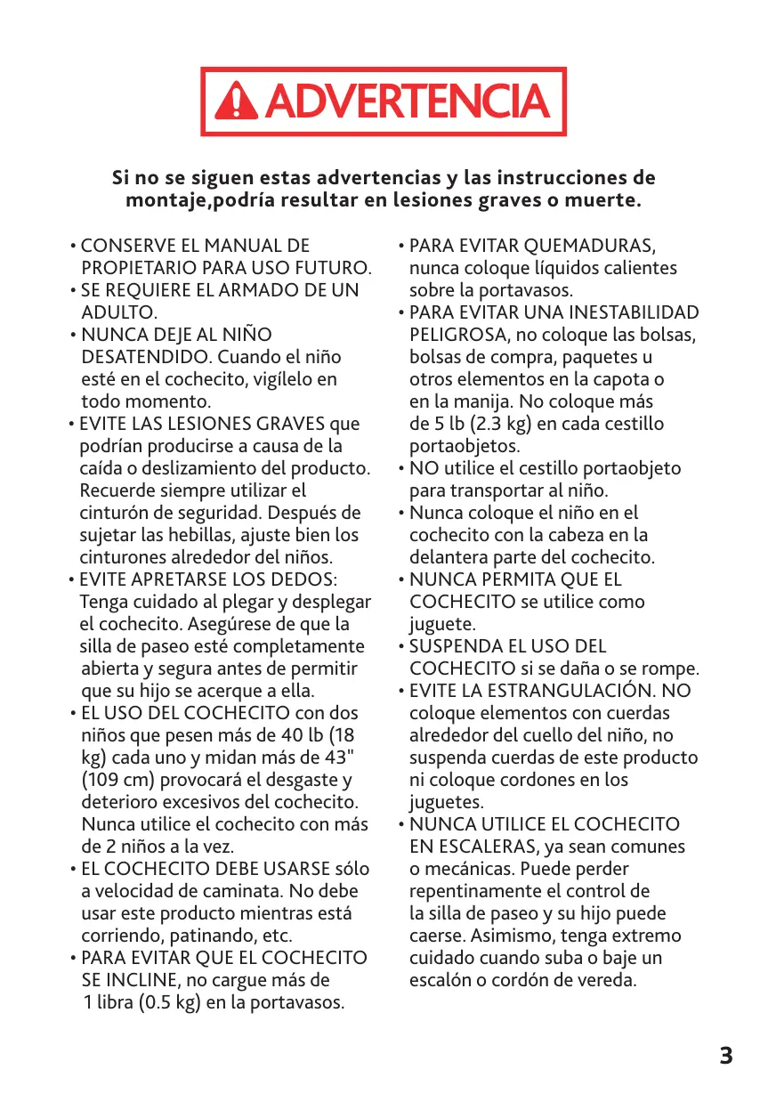 • CONSERVE EL MANUAL DE PROPIETARIO PARA USO FUTURO. • SE REQUIERE EL ARMADO DE UN ADULTO. • NUNCA DEJE AL NIÑO DESATENDIDO. Cuando el niño esté en el cochecito, vigílelo en todo momento. • EVITE LAS LESIONES GRAVES que podrían producirse a causa de la caída o deslizamiento del producto. Recuerde siempre utilizar el cinturón de seguridad. Después de sujetar las hebillas, ajuste bien los cinturones alrededor del niños. • EVITE APRETARSE LOS DEDOS: Tenga cuidado al plegar y desplegar el cochecito. Asegúrese de que la silla de paseo esté completamente abierta y segura antes de permitir que su hijo se acerque a ella. • EL USO DEL COCHECITO con dos niños que pesen más de 40 lb (18 kg) cada uno y midan más de 43" (109 cm) provocará el desgaste y deterioro excesivos del cochecito. Nunca utilice el cochecito con más de 2 niños a la vez. • EL COCHECITO DEBE USARSE sólo a velocidad de caminata. No debe usar este producto mientras está corriendo, patinando, etc. • PARA EVITAR QUE EL COCHECITO SE INCLINE, no cargue más de 1 libra (0.5 kg) en la portavasos.