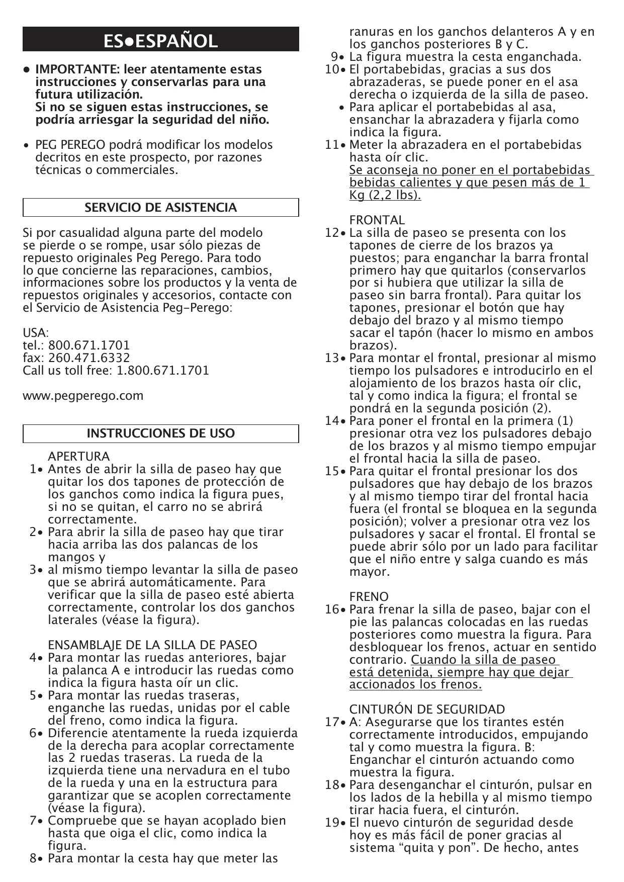 Si por casualidad alguna parte del modelo se pierde o se rompe, usar sólo piezas de repuesto originales Peg Perego. Para todo lo que concierne las reparaciones, cambios, informaciones sobre los productos y la venta de repuestos originales y accesorios, contacte con el Servicio de Asistencia Peg-Perego: USA: tel.: 800.671.1701 fax: 260.471.6332 Call us toll free: 1.800.671.1701 www.pegperego.com