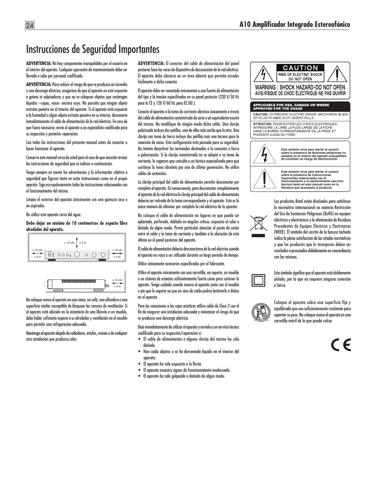 A10 ADVERTENCIA: El conector del cable de alimentación del panel posterior hace las veces de dispositivo de desconexión de la red eléctrica. El aparato debe ubicarse en un área abierta que permita acceder fácilmente a dicho conector. El aparato debe ser conectado únicamente a una fuente de alimentación del tipo y la tensión especificados en su panel posterior (230 V/50 Hz para la CE y 120 V/60 Hz para EE.UU.). Conecte el aparato a la toma de corriente eléctrica únicamente a través del cable de alimentación suministrado de serie o un equivalente exacto del mismo. No modifique de ningún modo dicho cable. Una clavija polarizada incluye dos patillas, una de ellas más ancha que la otra. Una clavija con toma de tierra incluye dos patillas más una tercera para la conexión de masa. Esta configuración está pensada para su seguridad. No intente desactivar los terminales destinados a la conexión a tierra o polarización. Si la clavija suministrada no se adapta a su toma de corriente, le rogamos que consulte a un técnico especializado para que sustituya la toma obsoleta por una de última generación. No utilice cables de extensión. La clavija principal del cable de alimentación permite desconectar por completo el aparato. En consecuencia, para desconectar completamente el aparato de la red eléctrica la clavija principal del cable de alimentación debería ser retirada de la toma correspondiente y el aparato. Esta es la única manera de eliminar por completo la red eléctrica de la aparato. No coloque el cable de alimentación en lugares en que pueda ser aplastado, perforado, doblado en ángulos críticos, expuesto al calor o dañado de algún modo. Preste particular atención al punto de unión entre el cable y la toma de corriente y también a la ubicación de esta última en el panel posterior del aparato. El cable de alimentación debería desconectarse de la red eléctrica cuando el aparato no vaya a ser utilizado durante un largo período de tiempo. Este símbolo sirve para alertar al usuario sobre la presencia de tensiones peligrosas no aisladas en el interior del aparato susceptibles de constituir un riesgo de electrocución. Este símbolo sirve para alertar al usuario sobre la presencia de instrucciones importantes relacionadas con el funcionamiento y el mantenimiento (servicio técnico) tanto en este manual como en la literatura que acompaña al producto. Los productos Rotel están diseñados para satisfacer la normativa internacional en materia Restricción del Uso de Sustancias Peligrosas (RoHS) en equipos eléctricos y electrónicos y la eliminación de Residuos Procedentes de Equipos Eléctricos y Electrónicos (WEEE). El símbolo del carrito de la basura tachado indica la plena satisfacción de las citadas normativas y que los productos que lo incorporan deben ser reciclados o procesados debidamente en concordancia con las mismas. Utilice únicamente accesorios especificados por el fabricante. No coloque nunca el aparato en una cama, un sofá, una alfombra o una superficie similar susceptible de bloquear las ranuras de ventilación. Si el aparato está ubicado en la estantería de una librería o un mueble, debe haber suficiente espacio a su alrededor y ventilación en el mueble para permitir una refrigeración adecuada. Mantenga al aparato alejado de radiadores, estufas, cocinas o de cualquier otra instalación que produzca calor. Utilice el aparato únicamente con una carretilla, un soporte, un mueble o un sistema de estantes suficientemente fuerte como para sostener la aparato. Tenga cuidado cuando mueva el aparato junto con el mueble o pie que lo soporte ya que en caso de caída podría lastimarle o daños en el aparato. Para las conexiones a las cajas acústicas utiliza cable de Clase 2 con el fin de asegurar una instalación adecuada y minimizar el riesgo de que se produzca una descarga eléctrica. Deje inmediatamente de utilizar el aparato y envíelo a un servicio técnico cualificado para su inspección/reparación si: