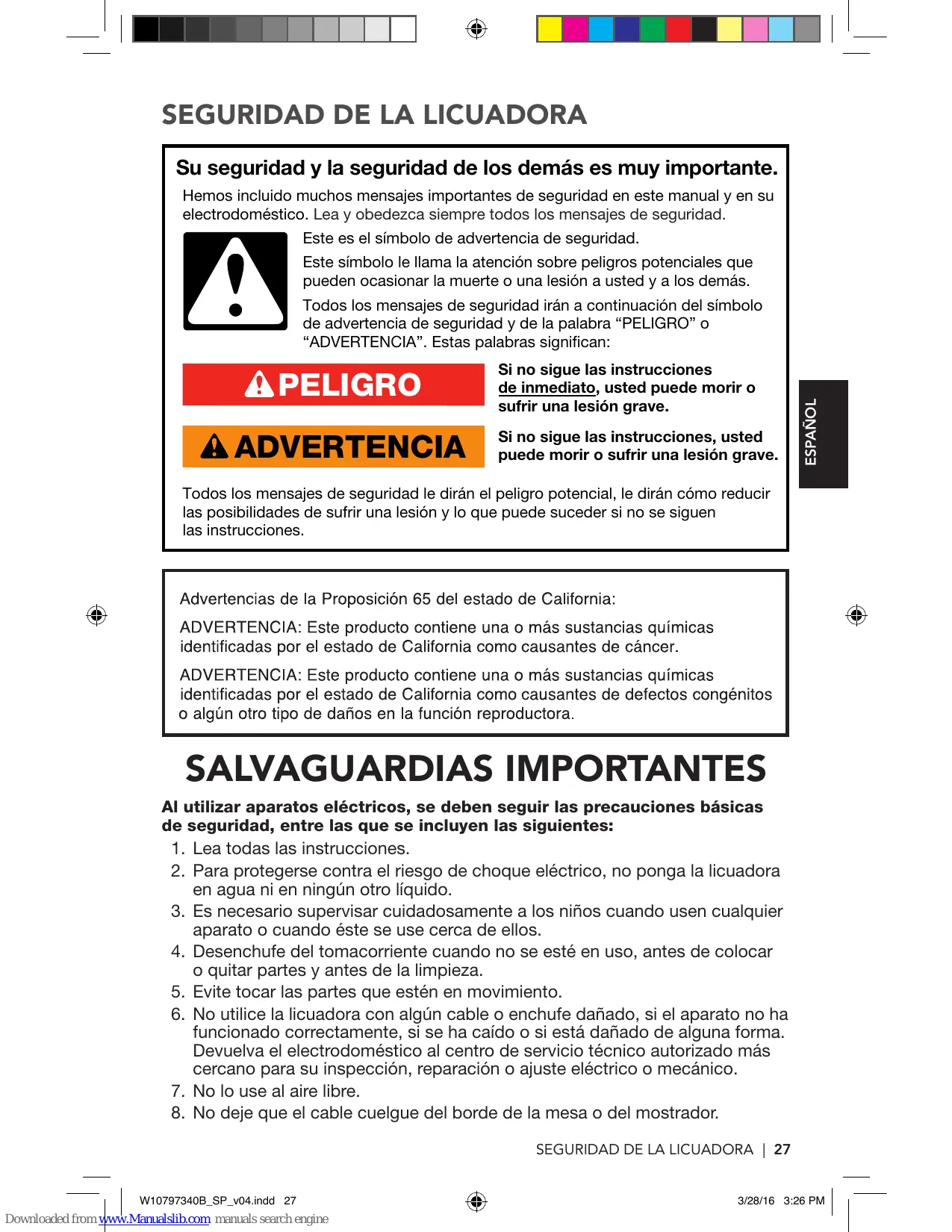 2. Para protegerse contra el riesgo de choque eléctrico, no ponga la licuadora en agua ni en ningún otro líquido. 3. Es necesario supervisar cuidadosamente a los niños cuando usen cualquier aparato o cuando éste se use cerca de ellos. 4. Desenchufe del tomacorriente cuando no se esté en uso, antes de colocar o quitar partes y antes de la limpieza. 5. Evite tocar las partes que estén en movimiento. 6. No utilice la licuadora con algún cable o enchufe dañado, si el aparato no ha funcionado correctamente, si se ha caído o si está dañado de alguna forma. Devuelva el electrodoméstico al centro de servicio técnico autorizado más cercano para su inspección, reparación o ajuste eléctrico o mecánico. 7. No lo use al aire libre. 8. No deje que el cable cuelgue del borde de la mesa o del mostrador. SEGURIDAD DE LA LICUADORA | 27 W10797340B_SP_v04.indd 27