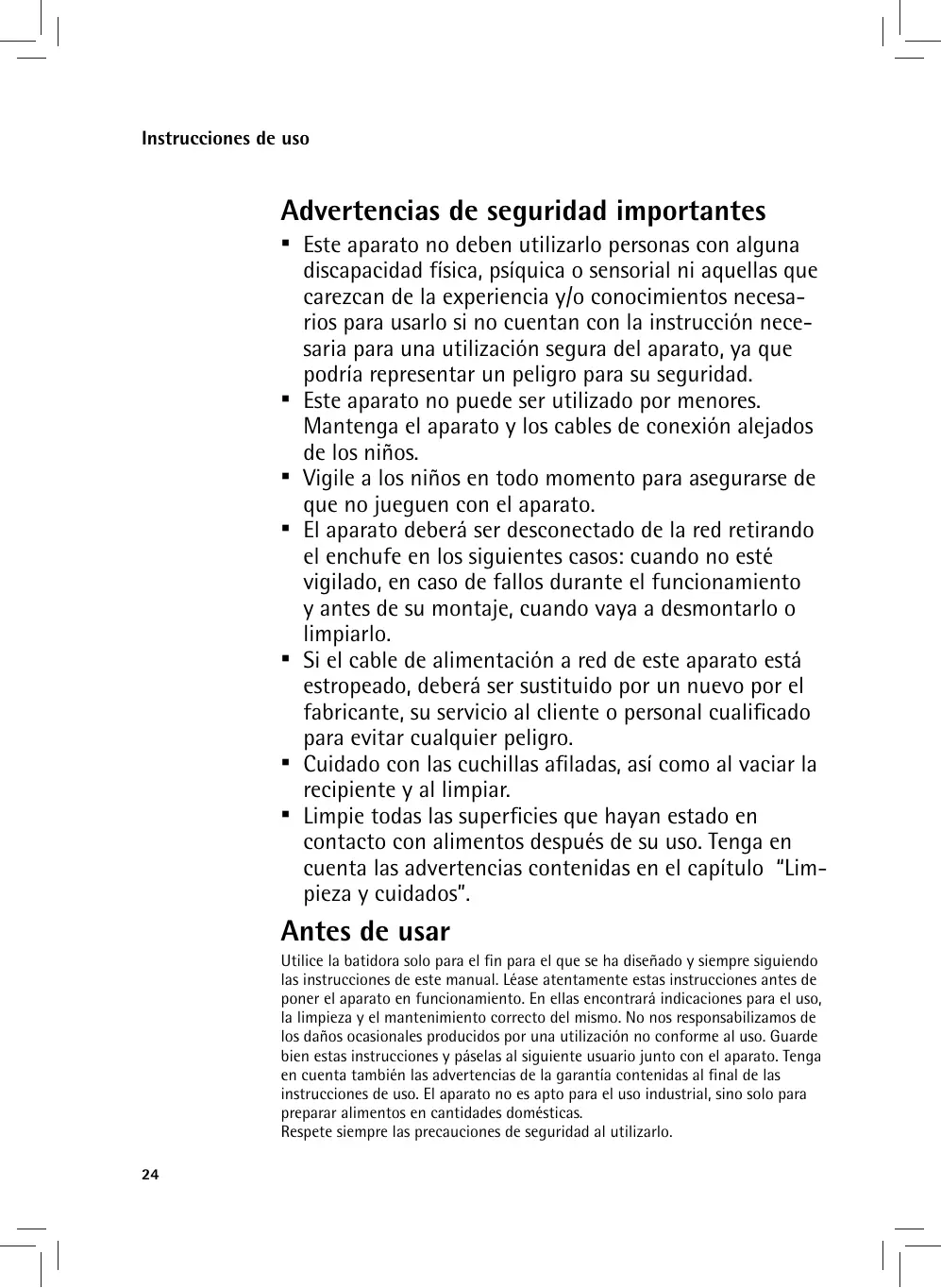 Utilice la batidora solo para el fin para el que se ha diseñado y siempre siguiendo las instrucciones de este manual. Léase atentamente estas instrucciones antes de poner el aparato en funcionamiento. En ellas encontrará indicaciones para el uso, la limpieza y el mantenimiento correcto del mismo. No nos responsabilizamos de los daños ocasionales producidos por una utilización no conforme al uso. Guarde bien estas instrucciones y páselas al siguiente usuario junto con el aparato. Tenga en cuenta también las advertencias de la garantía contenidas al final de las instrucciones de uso. El aparato no es apto para el uso industrial, sino solo para preparar alimentos en cantidades domésticas. Respete siempre las precauciones de seguridad al utilizarlo. 24