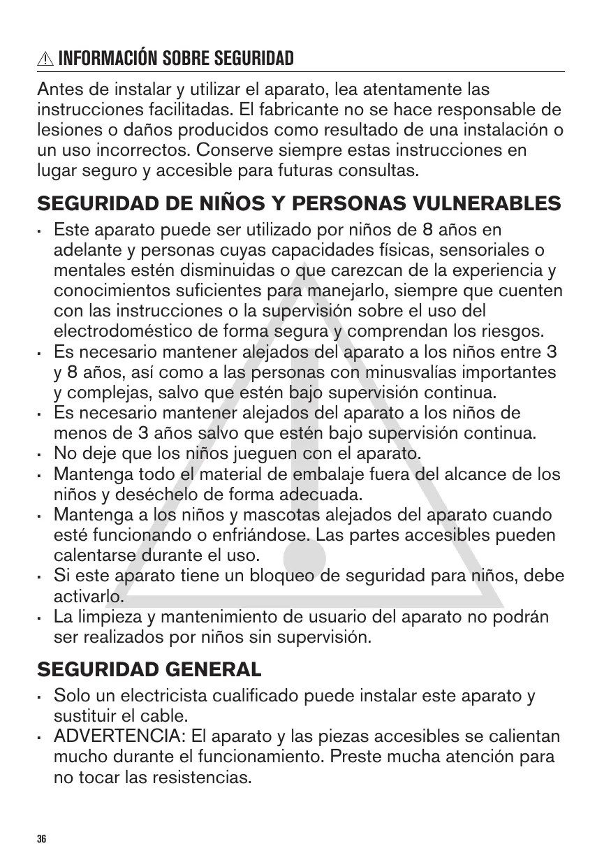 Es necesario mantener alejados del aparato a los niños entre 3 y 8 años, así como a las personas con minusvalías importantes y complejas, salvo que estén bajo supervisión continua. Es necesario mantener alejados del aparato a los niños de menos de 3 años salvo que estén bajo supervisión continua. No deje que los niños jueguen con el aparato. Mantenga todo el material de embalaje fuera del alcance de los niños y deséchelo de forma adecuada. Mantenga a los niños y mascotas alejados del aparato cuando esté funcionando o enfriándose. Las partes accesibles pueden calentarse durante el uso. Si este aparato tiene un bloqueo de seguridad para niños, debe activarlo. La limpieza y mantenimiento de usuario del aparato no podrán ser realizados por niños sin supervisión.