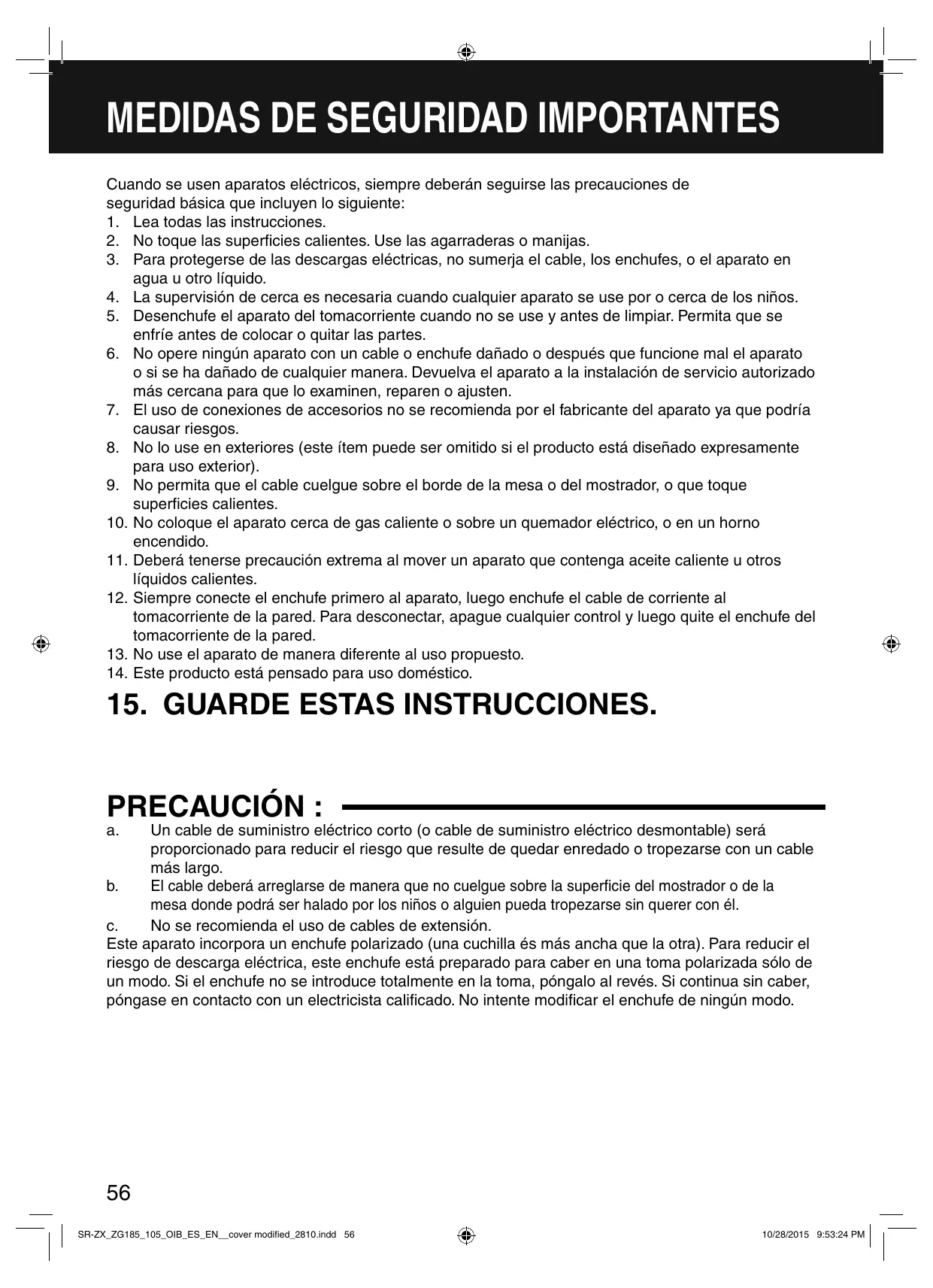 10/28/2015 7:17:16 PM MEDIDAS DE SEGURIDAD IMPORTANTES Cuando se usen aparatos eléctricos, siempre deberán seguirse las precauciones de seguridad básica que incluyen lo siguiente: