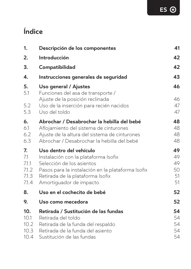 ADVERTENCIA 1. Por favor, lea detenidamente las instrucciones de uso antes de usar el portabebés por primera vez. Un uso incorrecto puede poner en peligro la vida de su hijo. 2. Muchas lesiones se provocan por mero descuido y es sencillo evitarlas. 3. No se permite realizar ninguna modificación en el sistema de retención para niños. Al hacerlo, su eficacia para la protección queda perjudicada o incluso totalmente anulada. Si experimenta alguna dificultad, le rogamos que lo consulte con su tienda o con el fabricante. 43