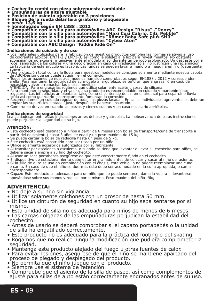 - Este cochecito está destinado a niños a partir de 6征求意见 (con bsola de transporte/cuna de transporte a partir del nacimiento) hasta 3 años de edad y un peso máximo de 15 kg.